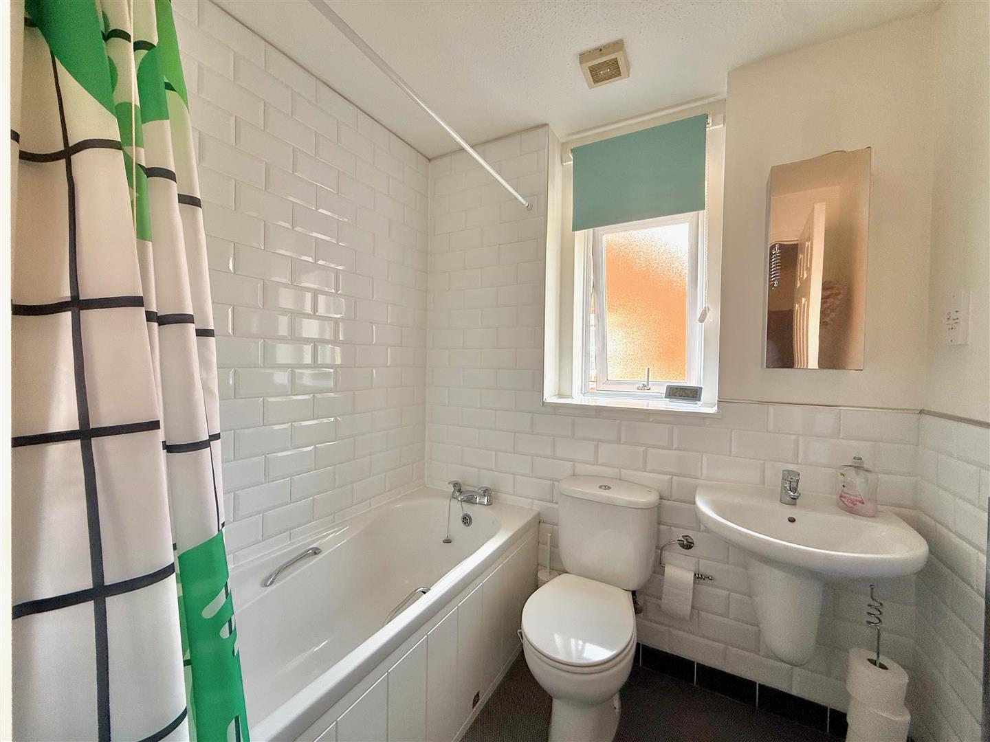 Bathroom - 1.96m x 1.68m (6'5 x 5'6) - Comprising a bath with a shower system over, tiled area surround and a shower rail and curtain, wall-mounted basin and wc. Mirrored cabinet. Chrome towel rail/radiator. Partly-tiled walls. Obscured window to the side elevation.