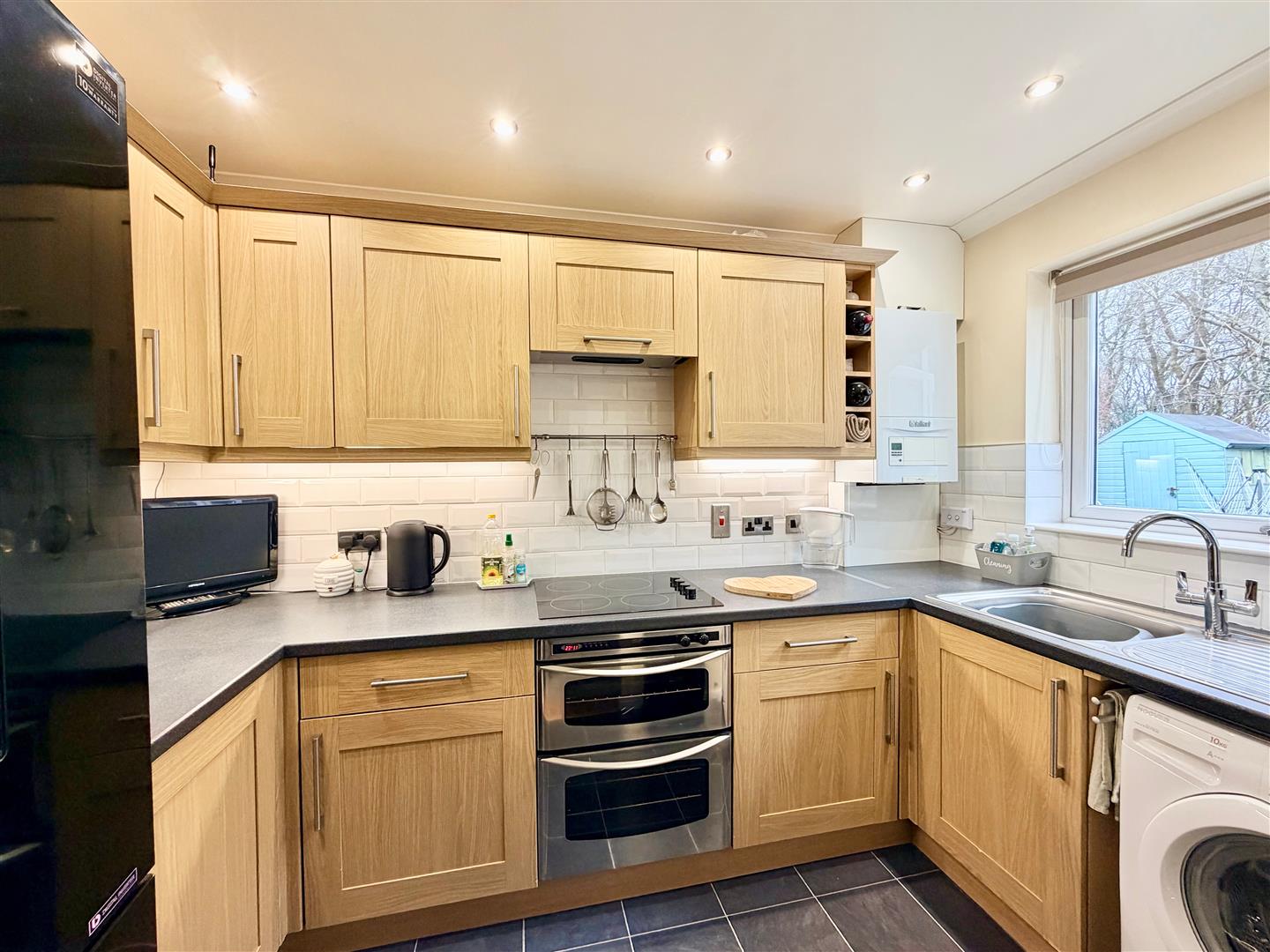 Kitchen - 3.05m x 1.83m (10' x 6') - Range of base and wall-mounted cabinets with matching fascias, work surfaces and tiled splash-backs. Stainless-steel single drainer sink unit. Built-in double oven and grill. Separate hob. Space for fridge-freezer. Space for washing machine. Wall-mounted gas boiler. Inset ceiling spotlights. Window to the rear elevation overlooking the garden.