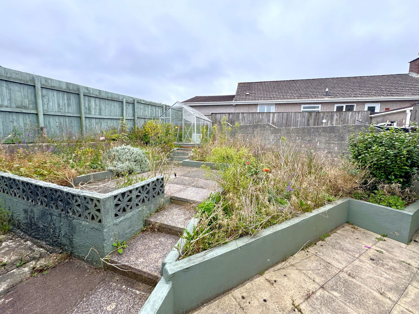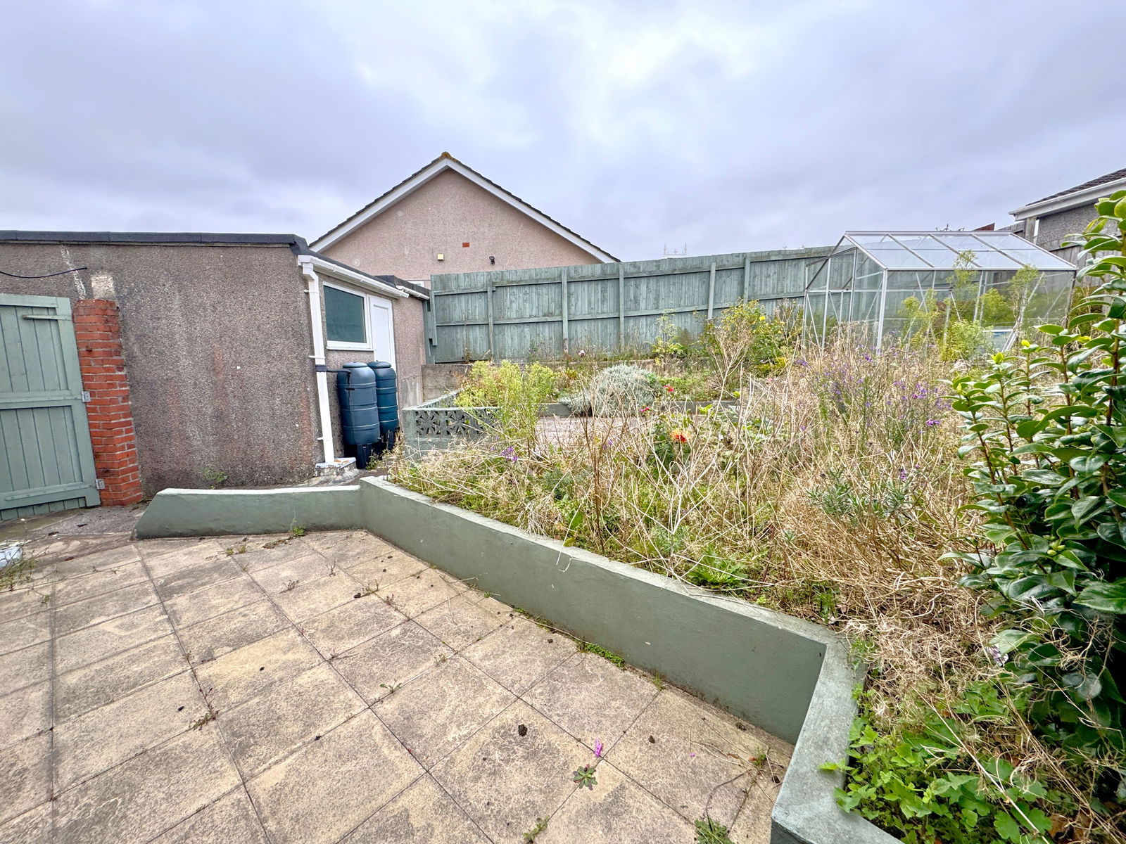 The rear garden is paved and incorporates a variety of established plants and shrubs. It is enclosed by a combination of fencing and wall boundaries.