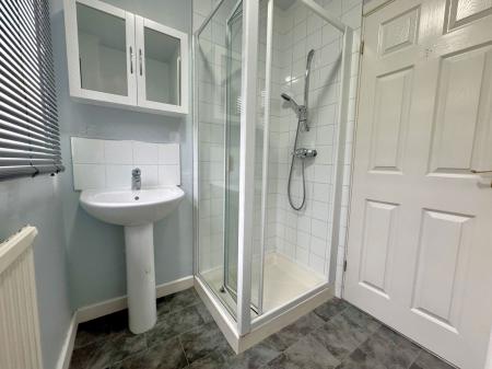 Comprising a tiled shower cubicle with inset shower, low-level WC, pedestal wash hand basin, PVCu double glazed frosted window, and built-in cupboard housing the gas boiler serving domestic hot water and central heating.