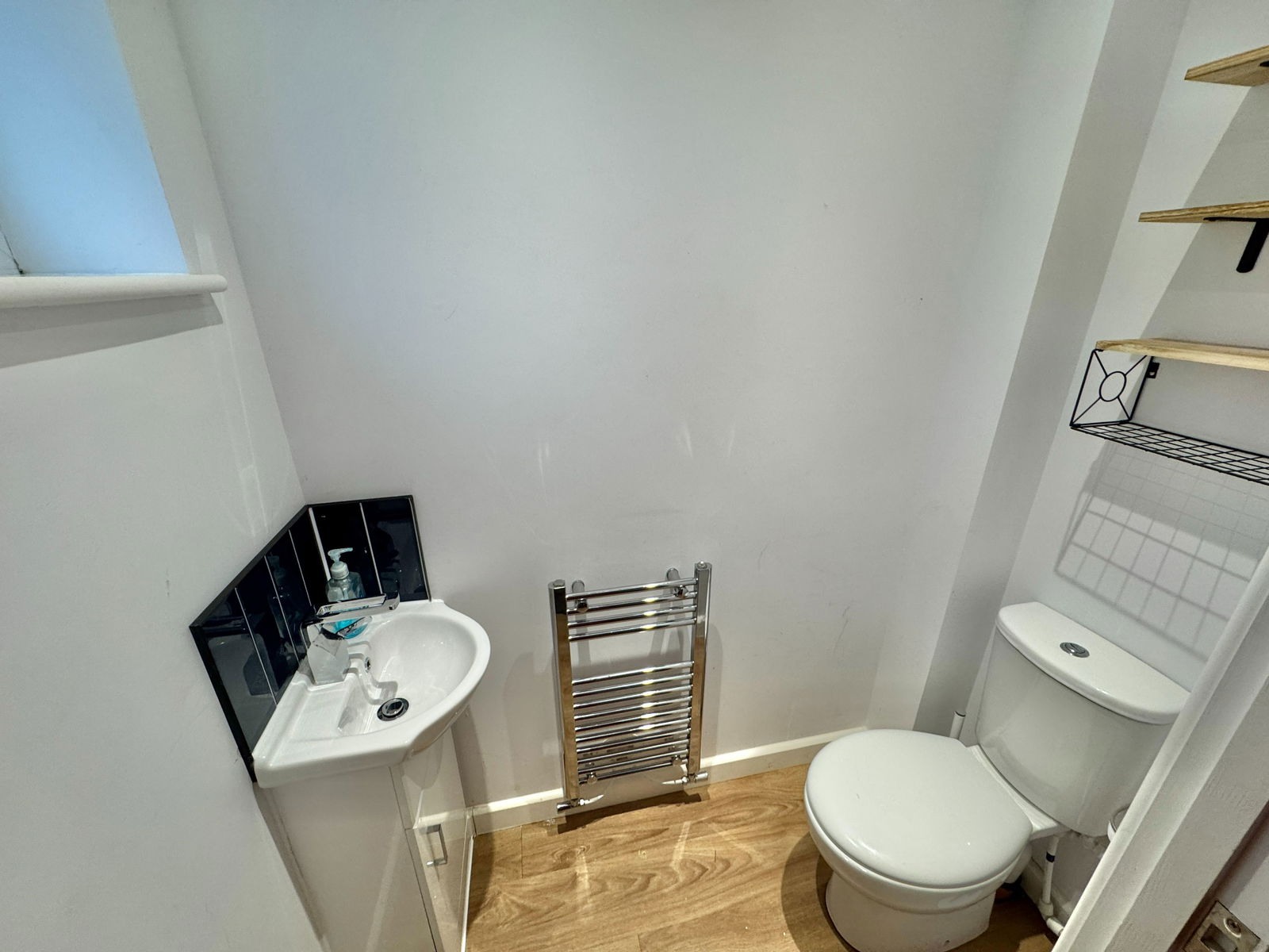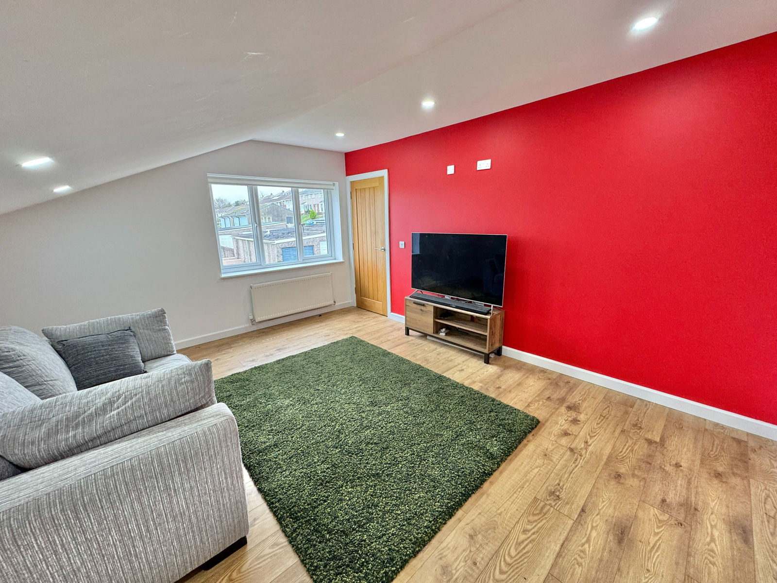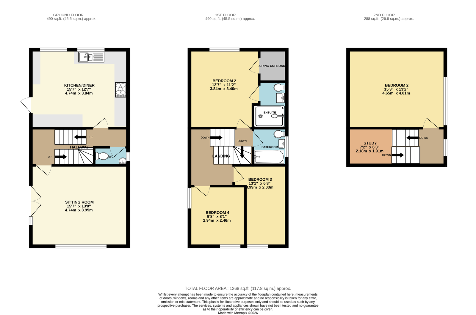 Ground floor lobby has a large walk in storage cupboard which goes beneath the stairs, carpeted stairs ascend to the second floor. Bedroom three, a small double with inset spotlights and a window to the rear elevation with views out over the playing fields and the railway. Bedroom four, a further small double has double aspect with windows to the side and rear elevations. Bedroom one a spacious double, vaulted ceiling, loft storage area, inset spotlights and a ceiling fan, window to the front elevation, wood effect flooring and en-suite; fitted with an oversized shower cubicle with a Myra electric shower unit with drencher head, tiled splashbacks, low level WC, pedestal wash hand basin with storage beneath, extractor fan, wood effect flooring and a chrome tower rail. A airing cupboard with a wall mounted combination boiler, radiator and slatted shelves. Bedroom two is a further large double with a window to the side elevation and inset spotlights. From the landing, a further small flight of steps leads up to a useful study area with spotlights.