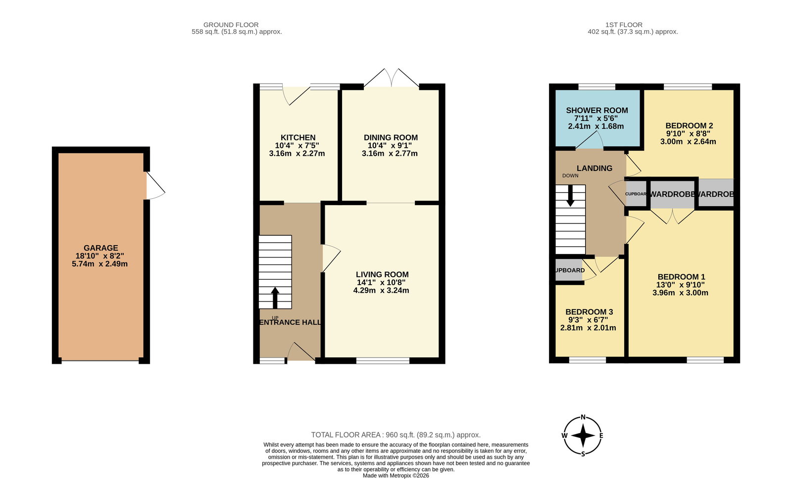 On the first floor, the landing leads to three bedrooms and a modern shower room.