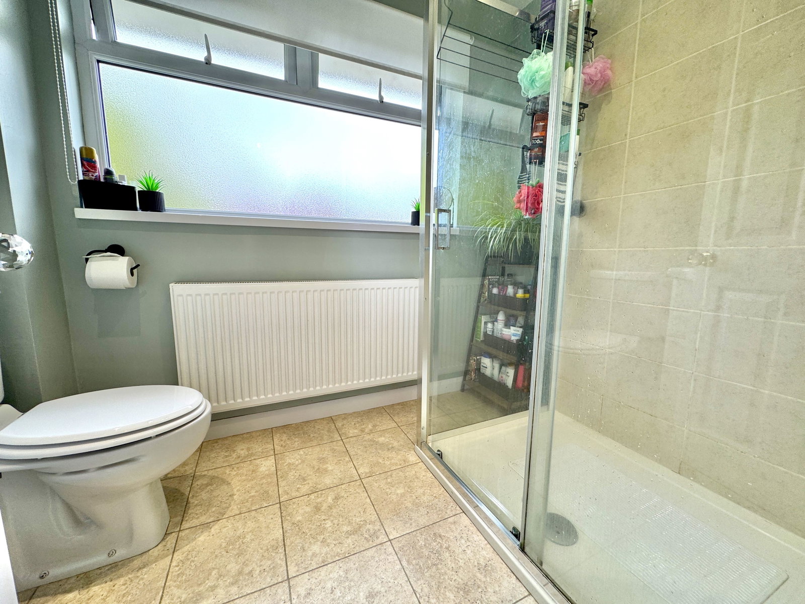 Comprising a tiled shower cubicle with inset shower, low-level WC, wash hand basin with storage under, shaver socket, radiator, and PVCu double-glazed frosted window to the rear.