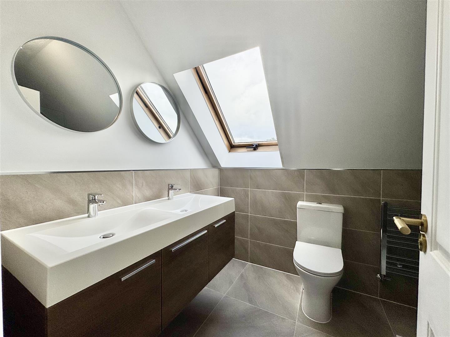 Shower Room - 2.50 x 1.89 (8'2" x 6'2") - Fitted with a matching suite comprising a double walk-in shower with waterfall attachment, 'his-&-hers' sinks with mixer tap set into a wall-mounted storage unit and close-coupled wc. Chrome heated towel rail. Shaving point. Extractor. Wooden double-glazed Velux window to the rear elevation.