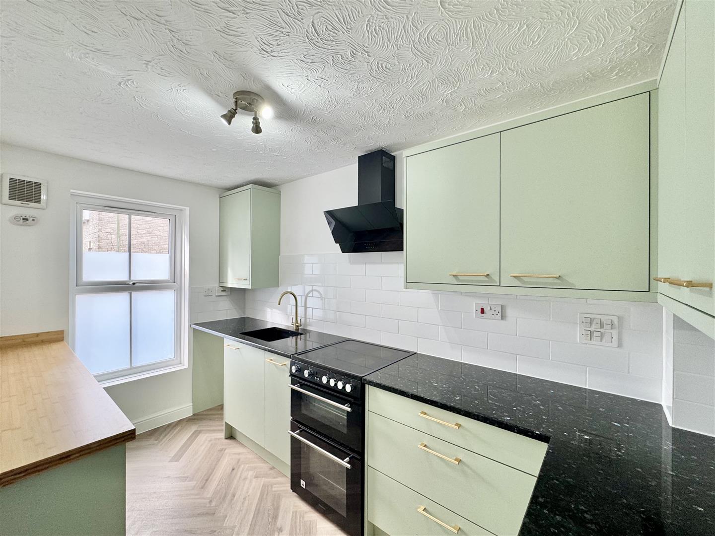 Kitchen - 3.62 x 1.9 (11'10" x 6'2") - Newly-fitted with a matching range of base and wall-mounted units incorporating a roll-edged emerald pearl granite worktop and a square-edged wooden worktop. Under-mounted composite sink with mixer tap and tiled splash-back. Spaces for washing machine, cooker and fridge/freezer. Extractor hood. uPVC double-glazed window to the front elevation.