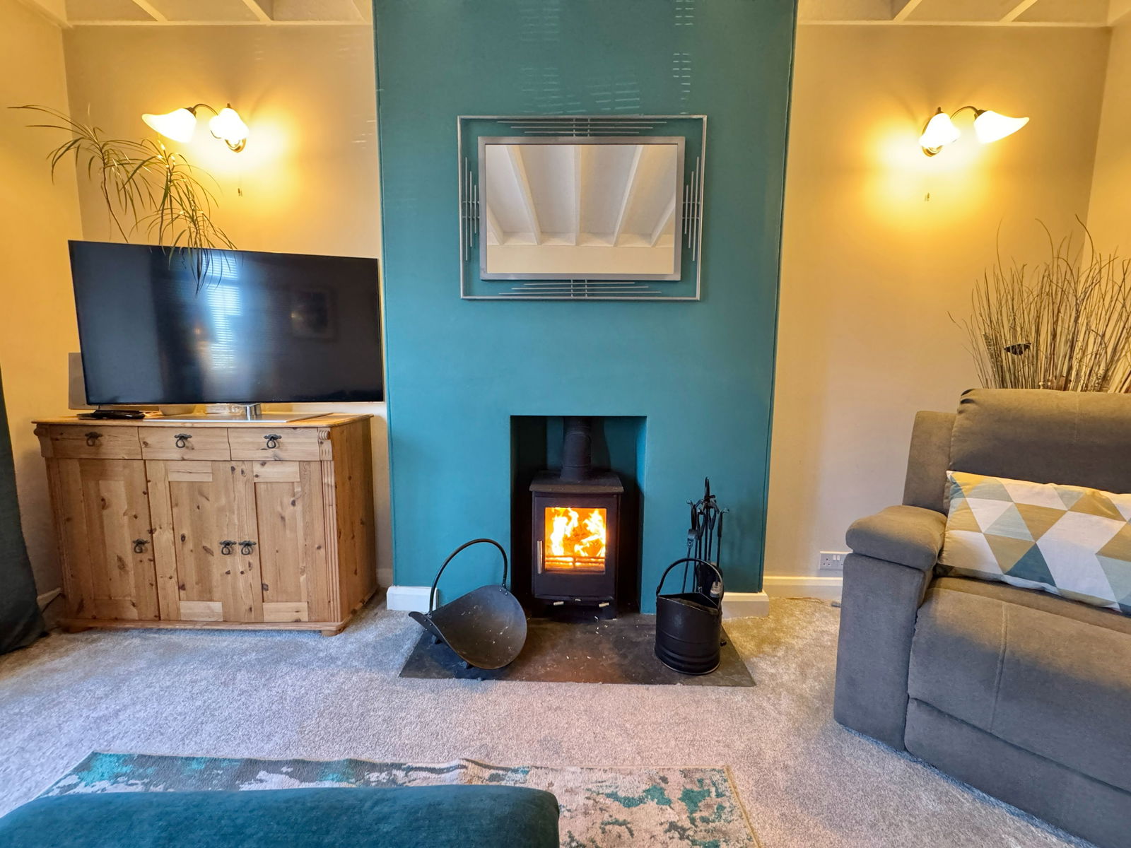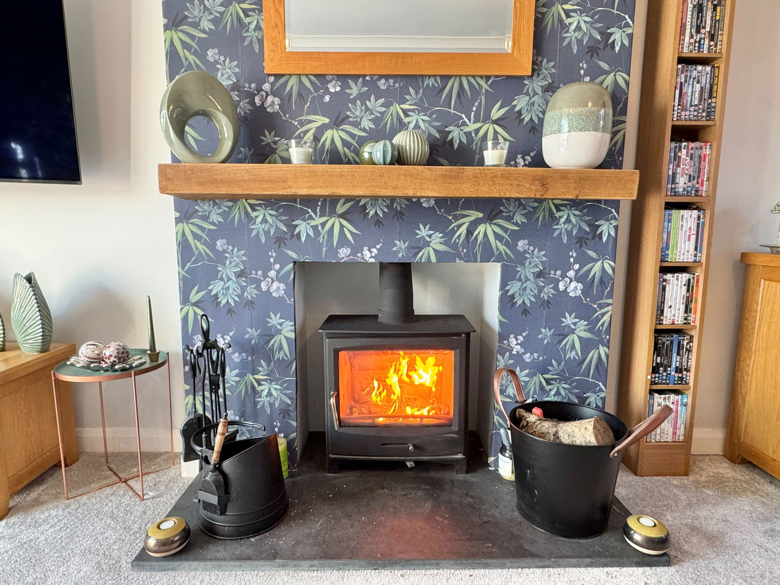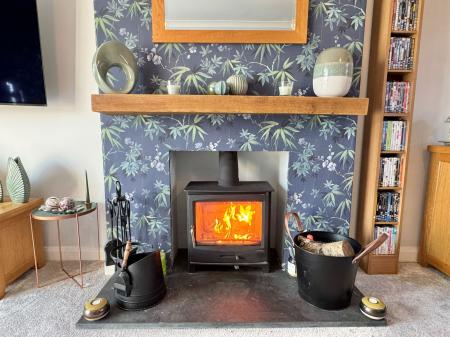 From main hallway, the doorway leads to the dining room with a bay window to the front elevation, a further multi fuel stove with a slate hearth and a beamed ceiling. The kitchen is fitted with a matching range base and eye level storage cupboards with post formed and roll top work surfaces, electric Zanussi double oven, four burner Zanussi induction hob, and filter canopy, dishwasher, one and a half bowl stainless steel sink drainer unit with a mixer tap and tiled splash backs, integral fridge/freezer and tiled flooring, a door to the rear garden, a door to the utility room with shelves, a fridge/freezer, washer dryer and a downstairs cloakroom; with a low level W.C and pedestal wash hand basin.