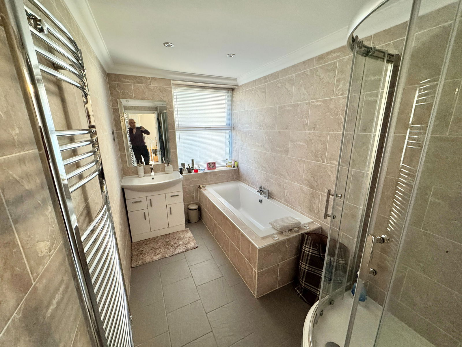 From the main hallway, carpeted stairs ascend to the first floor landing with a period stained glass window to the front and rear elevation, and a door to bedroom one; a spacious double with a window to the front elevation, moulded ceiling, an en-suite shower room; with a window to the rear elevation, W.C, wash hand basin with storage beneath an oversized shower cubicle with a direct feed shower unit, inset spotlights, moulded ceiling and tiled floors and walls. Bedroom two, a further double, a bay window to the front elevation, a large built in wardrobe with glass doors and a moulded ceiling. Bedroom three has a range of fitted wardrobes and a window to the rear elevation, wood effect flooring and a moulded ceiling. Family bathroom is fitted to a high standard, tile enclosed, double ended bath with a waterfall tap, oversized shower cubicle with drencher head, pedestal wash and basin inset spotlights and window to the side elevation, Chrome tower rail, tiled flooring and tiled walls. A separate cloak room with a low level W.C, and a window to the rear elevation. Carpeted spiral staircase leads to the second floor landing with a large built in storage cupboard and a door to bedroom four; with a Velux window to the rear elevation, large storage cupboard and a beamed ceiling. Bedroom five with a beamed ceiling, has a Velux window to the rear elevation with views to Plymouth Hoe and further eave storage.