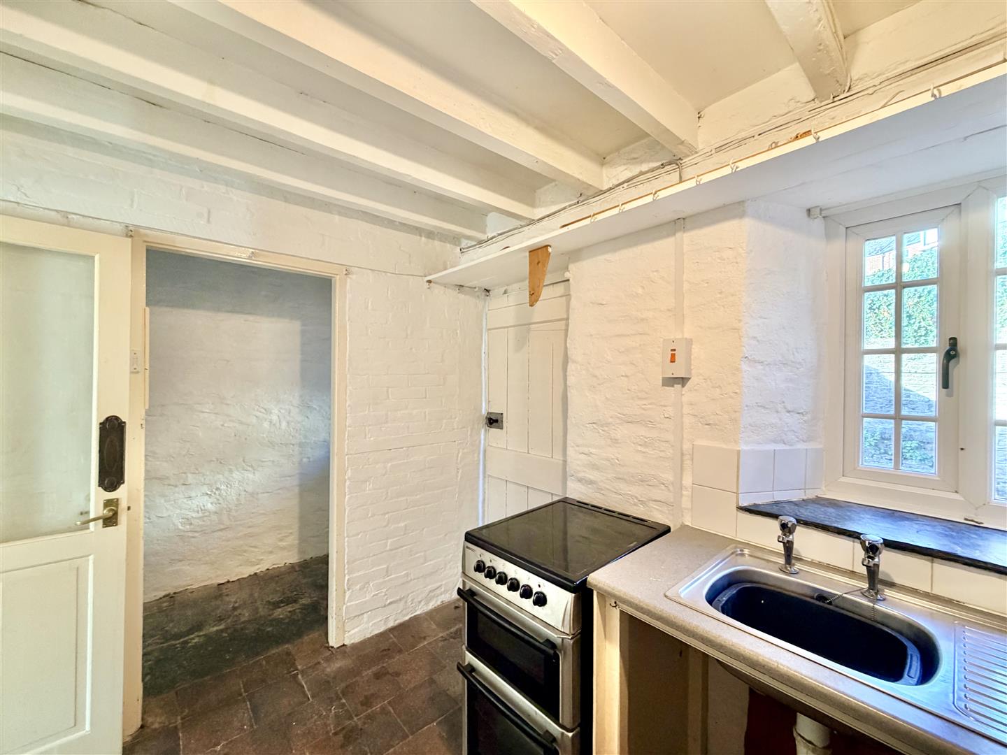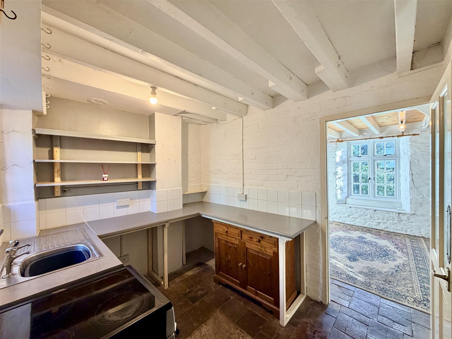 Kitchen - 4.06m x 2.36m (13'4 x 7'9) - Fitted work surfaces and tiled splash-backs. Inset stainless-steel sink. Wall-mounted shelving. Space for free-standing appliances. Stone paved floor. Window with a slate sill to the front elevation. Doorway opening into a pantry. The pantry is laid with slate flagstones and there is a small window to the front elevation. The pantry houses the electric meter and the consumer unit. Doorway opening into the living room.