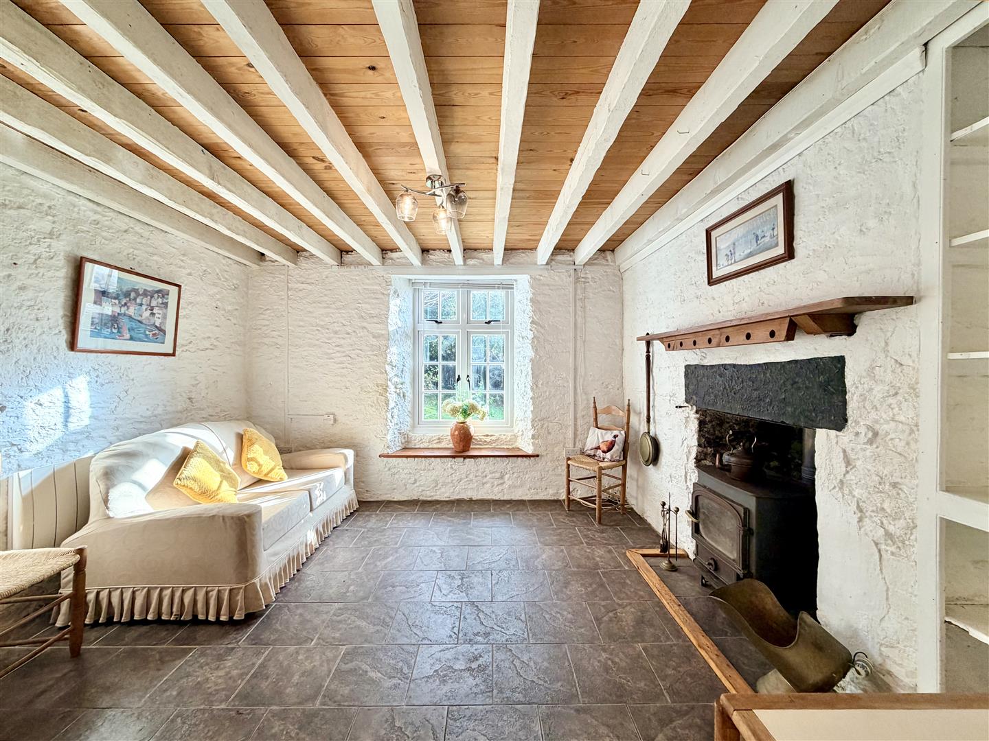 Kitchen/Living Room - 5.94m x 4.14m (19'6 x 13'7) - An open-plan dual aspect room running from front to rear, with windows to both the front and rear elevations. The kitchen area is fitted with a range of base-mounted cabinets with natural pine fascias and work surfaces. Inset stainless-steel single drainer sink unit. Space for free-standing appliances. Separate pantry fitted with shelving and with a small obscured window to the front elevation. Within the pantry is the electric meter and consumer unit. Ample space for seating and dining. Stone fireplace with wood burning stove and fitted shelving adjacent. Recessed storage cupboard. Wall-mounted electric heater. Tiled floor throughout. Natural pine staircase ascending to the top floor.