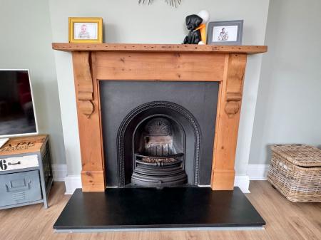 A doorway to the sitting room which is double aspect with a large window to the side elevation and a bay window to the front, period fireplace with a wooden surround and mantel, granite hearth, wood effect flooring and a coved ceiling.