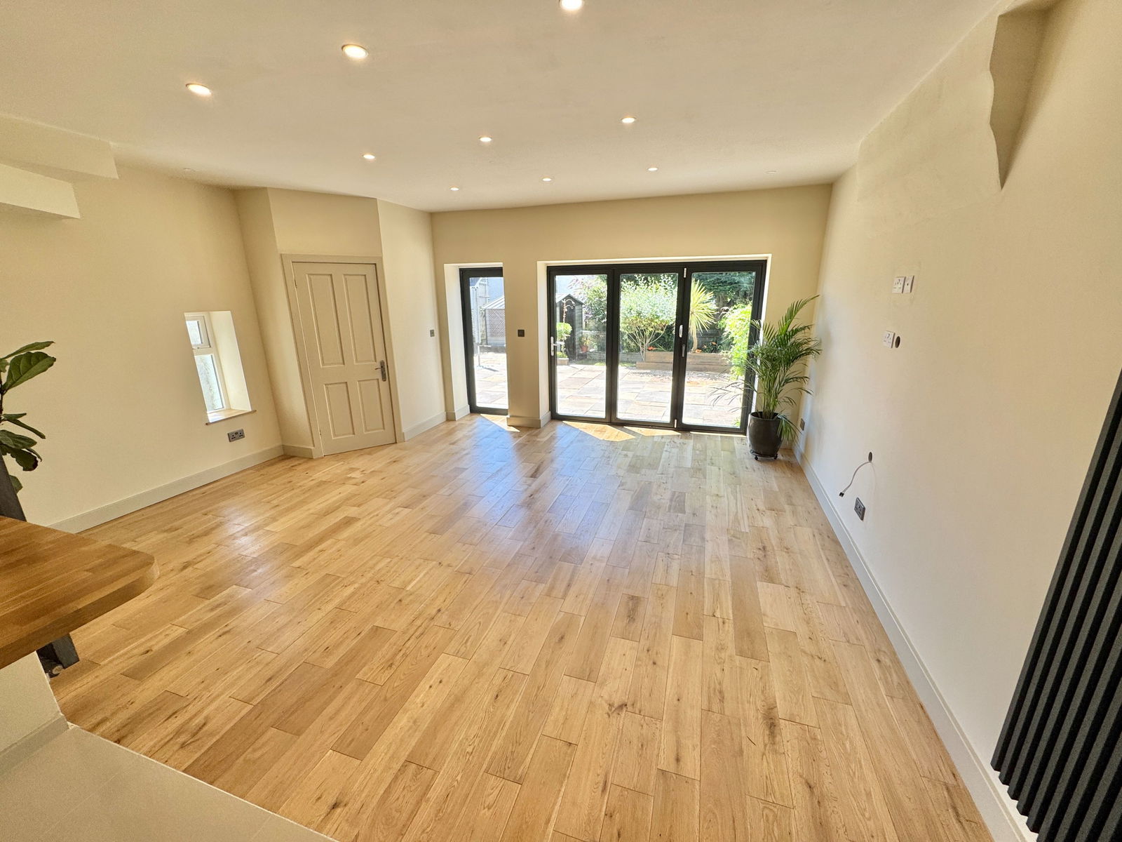From the main hallway, stairs descend to the lower ground floor where you’ll find a stunning open-plan kitchen, living, and family room—an ideal space for everyday living and entertaining. The kitchen is fitted with a stylish range of base and eye-level units, oak worktops, a ceramic sink with brass mixer tap, attractive glass-tiled splashbacks, an electric oven, hob, and extractor canopy. There is space for an American-style fridge/freezer, plumbing for a washing machine, and a wall-mounted combination boiler. A large oak breakfast bar separates the kitchen from the rest of the space. Porcelain tiles step down into the living area, which features oak flooring, bi-folding doors opening onto the rear garden, inset spotlights, a TV point, and a side window. A convenient cloakroom is also located on this level, fitted with a wash hand basin, low-level WC, and a window to the side.