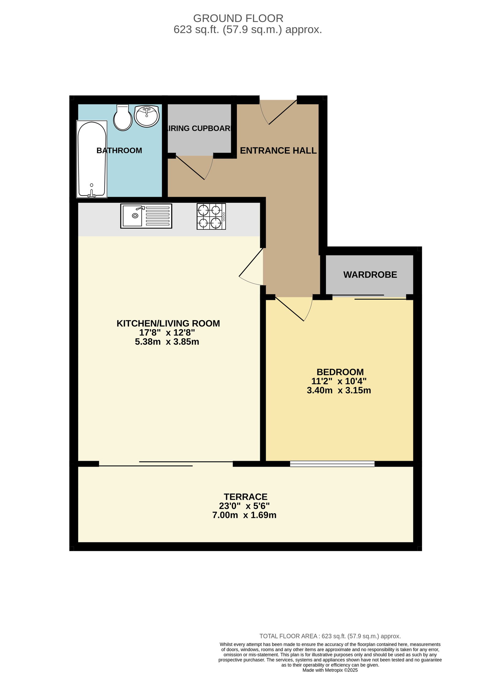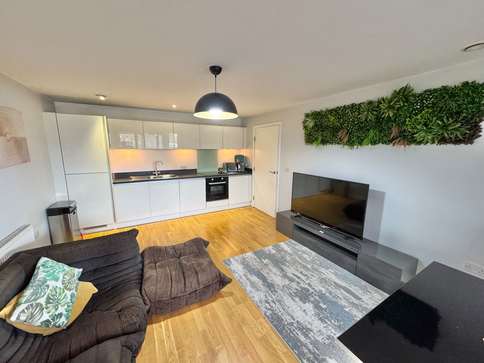 Lawson are delighted to market this well-appointed first-floor apartment on Millbay Road, just a short walk from the ferry port, Plymouth City Centre, Plymouth Hoe, and all local amenities. The property is part of a well-managed block of similar apartments and benefits from accommodation comprising, a front door with video intercom leading into a communal hallway with lift and staircase to the first floor. An inner door opens to a spacious hallway with wooden flooring, a wall-mounted intercom, and an airing cupboard housing Baxi gas-fired combination boiler. A doorway leads into the open-plan living area with wooden flooring and a fitted kitchen with an electric oven, four burner induction hob, filter canopy, dishwasher, and fridge/freezer. Large sliding doors from the living area lead out to a flagged, railing-enclosed terrace with views over the neighbouring marina. The bedroom is a large double with a full-height window with shutters and built-in storage. The bathroom is fitted with a matching white three-piece suite comprising a low-level WC, pedestal wash hand basin, and panel-enclosed bath with direct-feed shower over, tiled splashbacks, and a chrome towel rail.