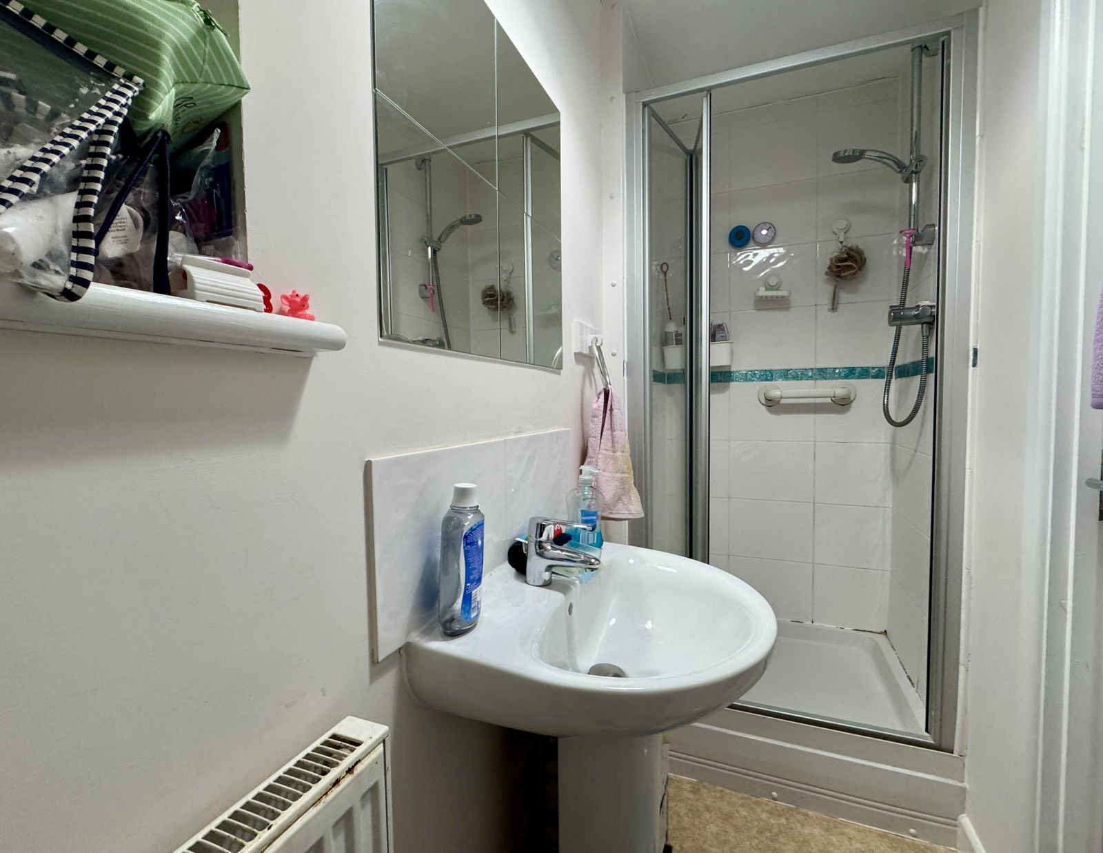 Tiled shower cubicle with inset shower, low level WC, pedestal wash hand basin, shaver socket, extractor fan and PVCu double glazed frosted window to the side.