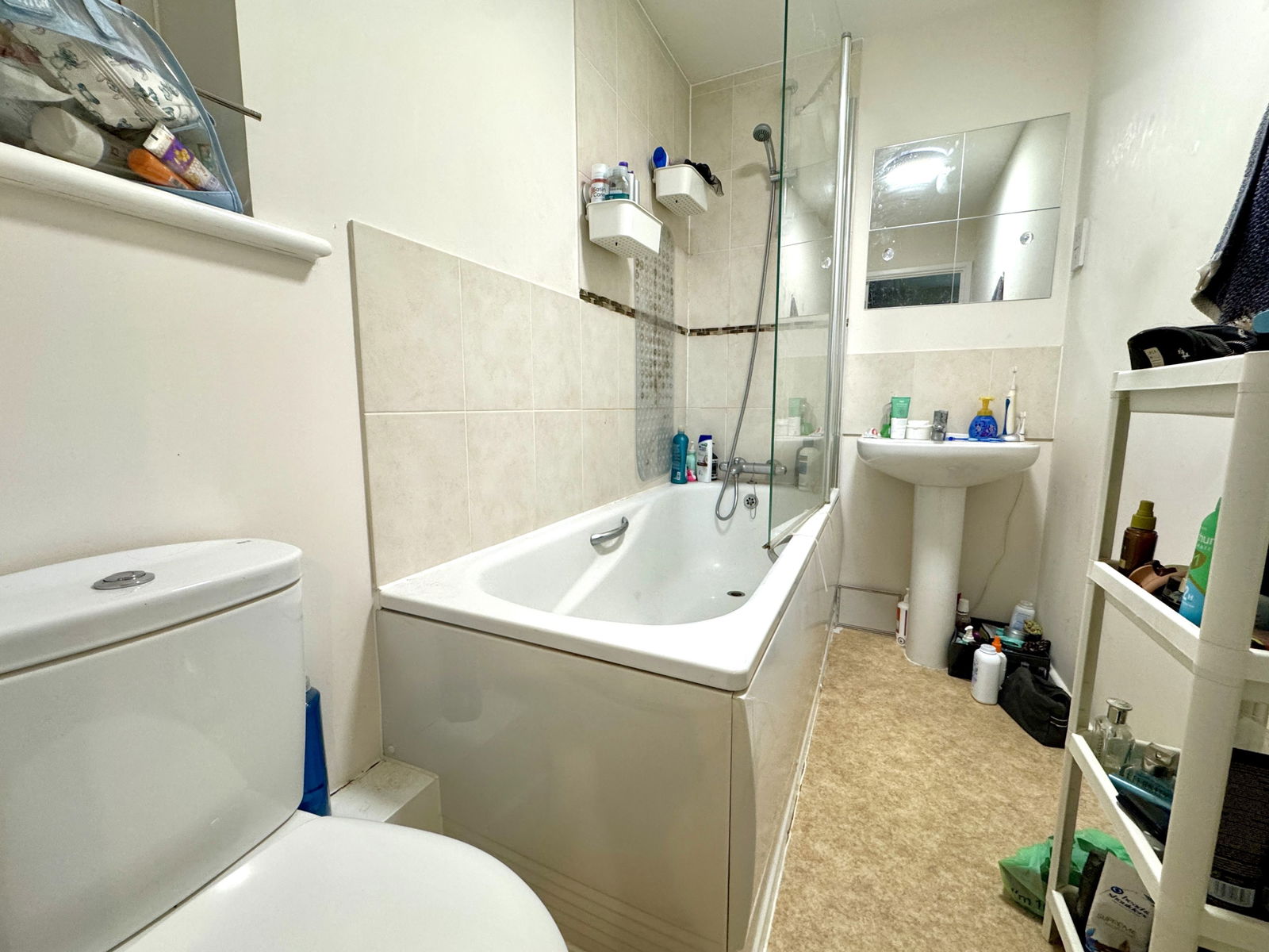 Panelled bath with shower attachment, low level WC, pedestal wash hand basin, extractor fan and PVCu double glazed frosted window to the side.