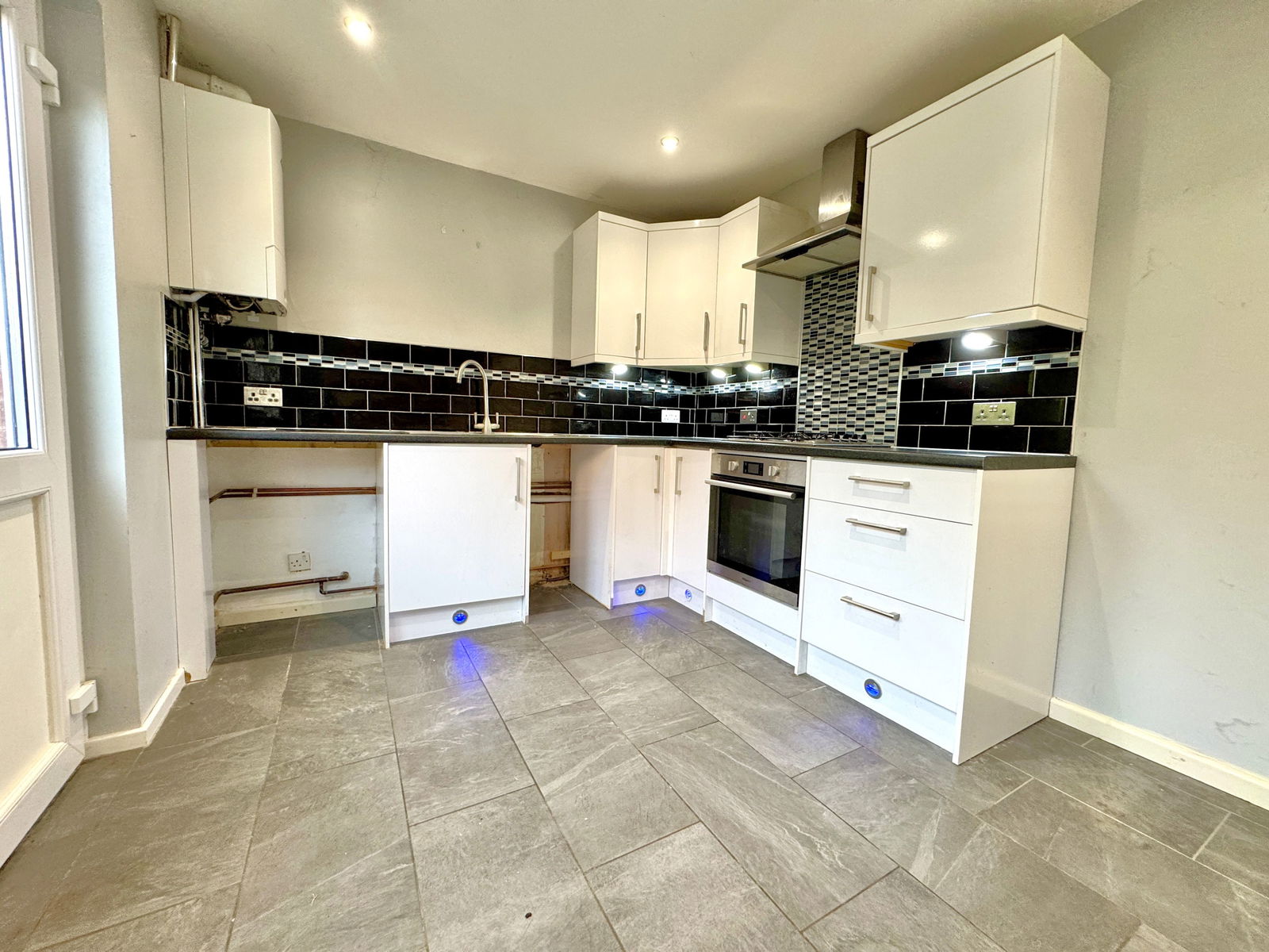 Roll edge worksurfaces with cupboard and drawers under and matching wall units with under lighting, single drainer stainless steel sink unit with a mixer tap, built in electric oven and four ring gas hob with extractor hood over, plumbing for a washing machine and for a slimline dishwasher, tiled flooring, tiled splash backs, radiator, wall mounted gas boiler which serves domestic hot water and central heating system, PVCu double glazed window and door to the rear garden.