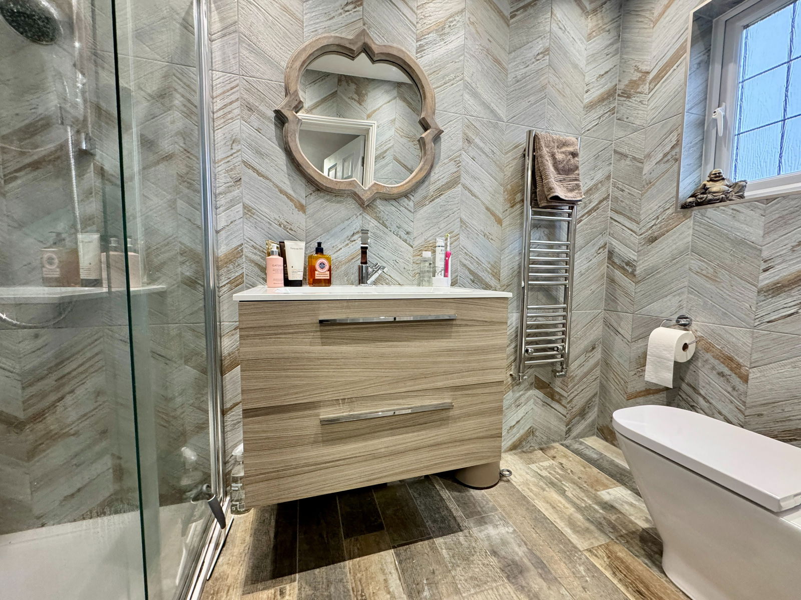 Comprising tiled shower cubicle with inset shower, wash hand basin with storage cupboards under, low level w.c, fully tiled walls, heated towel rail, extractor fan, PVCu double glazed frosted window to side.