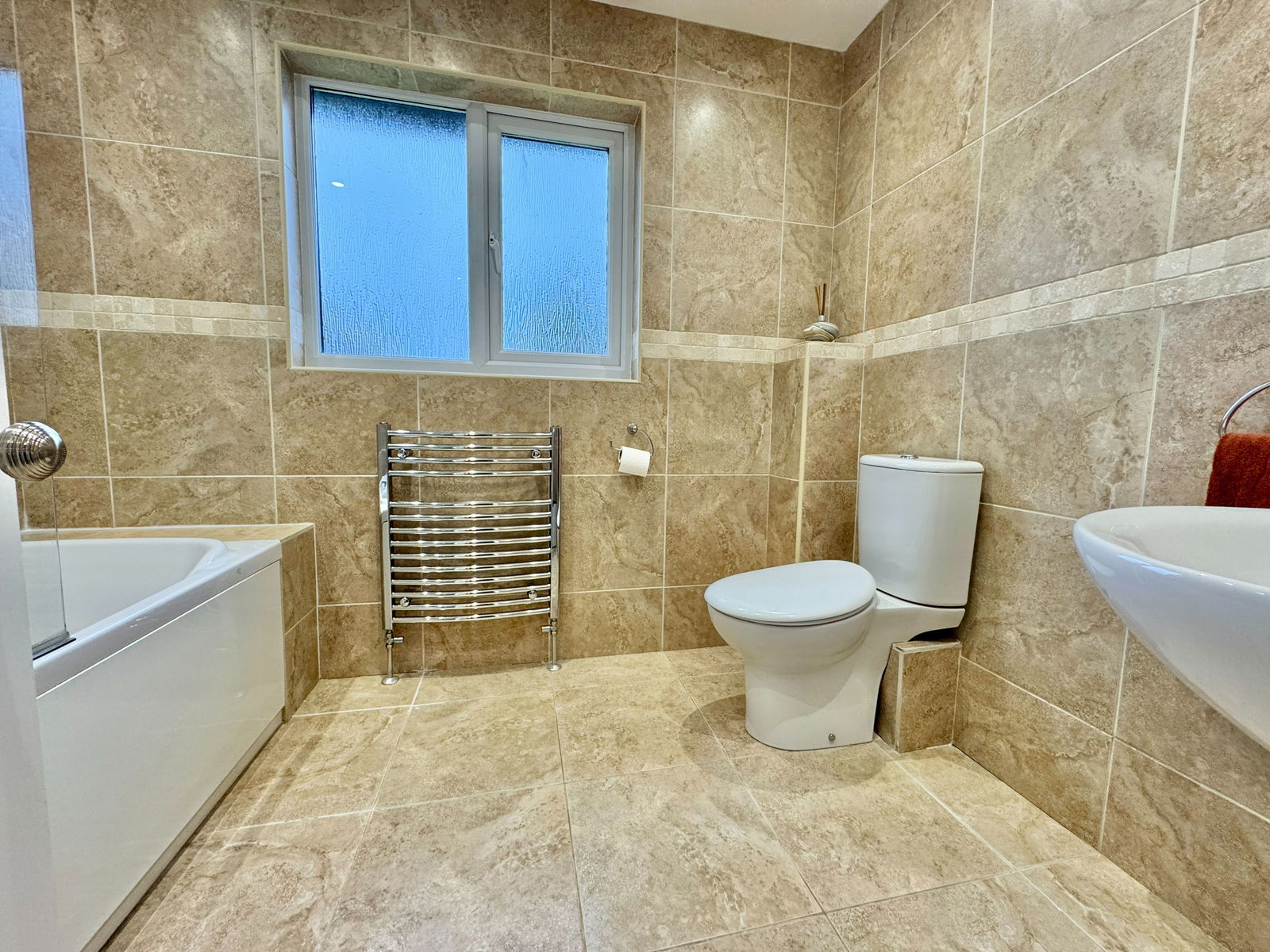 Matching suite comprising panelled bath with shower over, low level w.c, wash hand basin, fully tiled walls, tiled floor, heated towel rail, PVCu double glazed frosted window to rear.