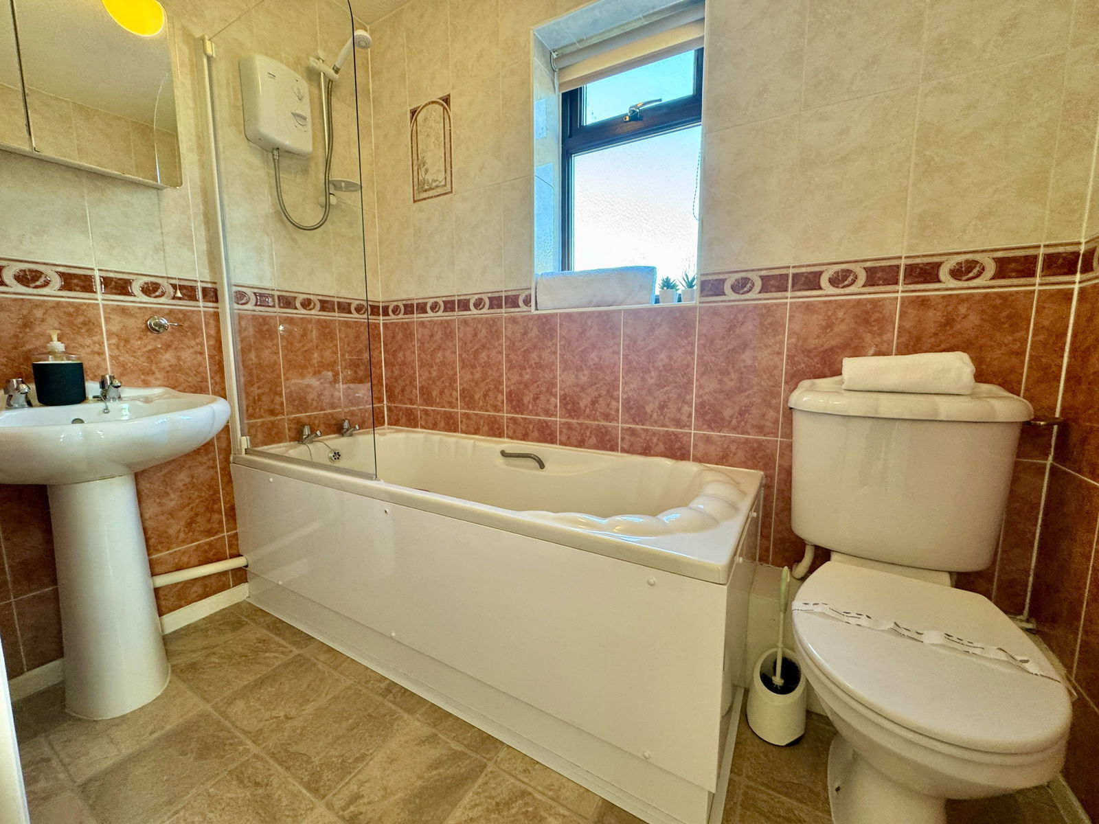 Matching suite comprising panelled bath with Triton electric shower over, low level wc, pedestal wash hand basin, shaver socket and light, fully tiled walls, radiator, PVCu double glazed frosted window to side.