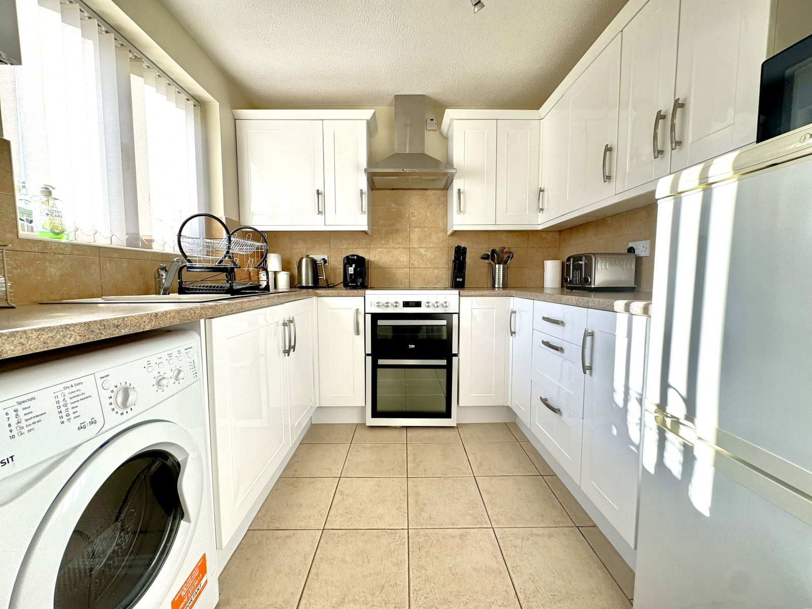 Roll edged work surfaces with cupboards and drawers under and matching wall units, single drainer stainless steel sink unit with mixer tap, plumbing for washing machine, electric cooker point, wall mounted gas boiler which serves domestic hot water and central heating system, tiled splashbacks, PVCu double glazed window to front.