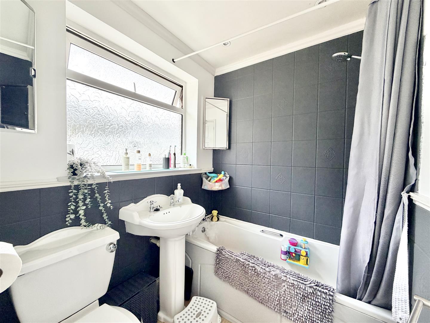 Bathroom - 1.85 x 1.55 (6'0" x 5'1") - Fitted with a matching suite comprising panel bath with an electric shower over, pedestal wash handbasin and a close-coupled WC. Obscured uPVC double-glazed window to the rear elevation.