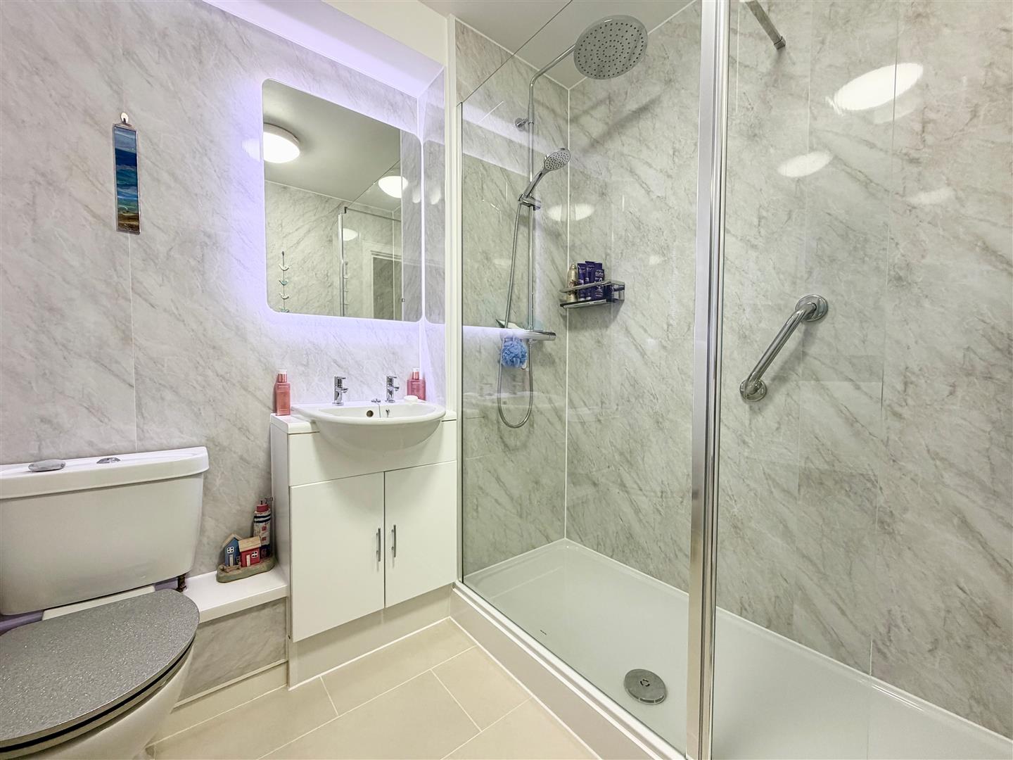 Shower Room - 2.02 x 1.89 (6'7" x 6'2") - Matching suite with stone-effect aqua-boarding to the walls and comprising a walk-in shower with waterfall attachment, vanity wash handbasin with storage beneath and a close-coupled WC. Grey heated towel rail. Extractor. Tiled floor. Illuminated wall-mounted mirror.