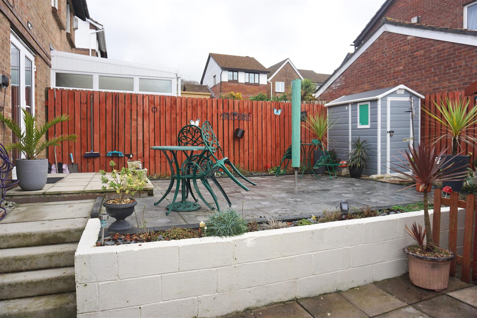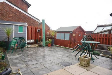 Outside - The property is approached via a couple of steps leading up to the front door, this is bordered on one side by a section of stone chippings and a driveway running alongside the property allowing off-road parking for two cars. There is a wooden gate giving access to the rear garden. To the rear of the property is an enclosed garden laid for ease of maintenance with a large slate large patio seating area. Boundaries are slatted wood fencing. At the rear boundary is a uPVC garden shed with power available. Outside power and water.