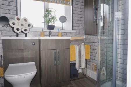 Shower Room - 1.79 x 1.66 (5'10" x 5'5") - Attractive matching suite of corner shower cubicle, close-coupled wc with hidden cistern and wall-mounted wash hand basin with integrated storage cupboards below and matching wall-mounted unit. Chrome heated towel rail. uPVC obscured double-glazed window to rear elevation.