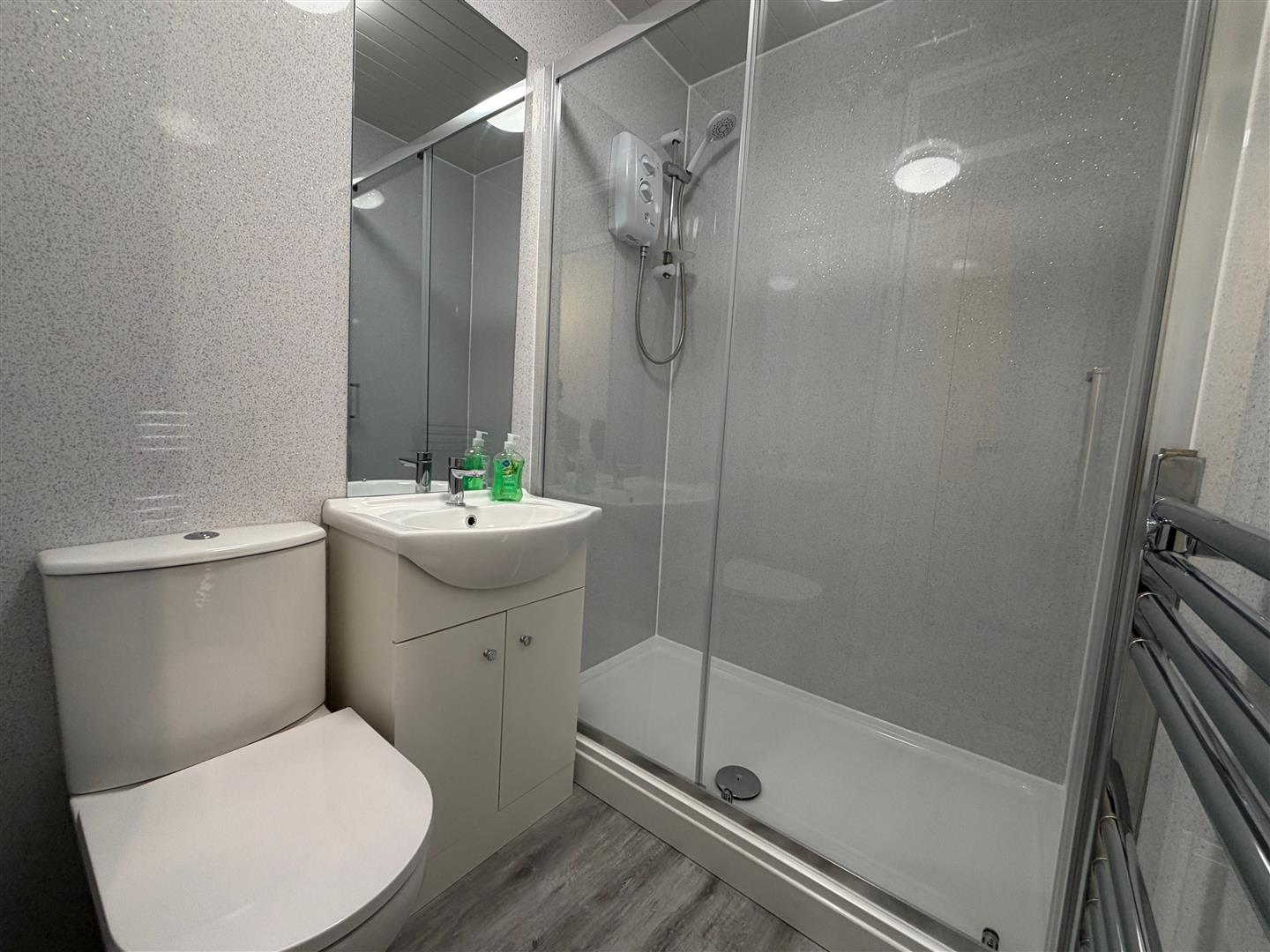 Shower Room - 1.86 x 1.33 (6'1" x 4'4") - Newly-fitted with a matching suite comprising a double-sized walk-in cubicle with an electric shower, vanity-style wash handbasin with mixer tap and storage beneath and a close-coupled wc. Chrome heated towel rail. Aqua-boarding to walls. Vinyl flooring. Extraction vent.