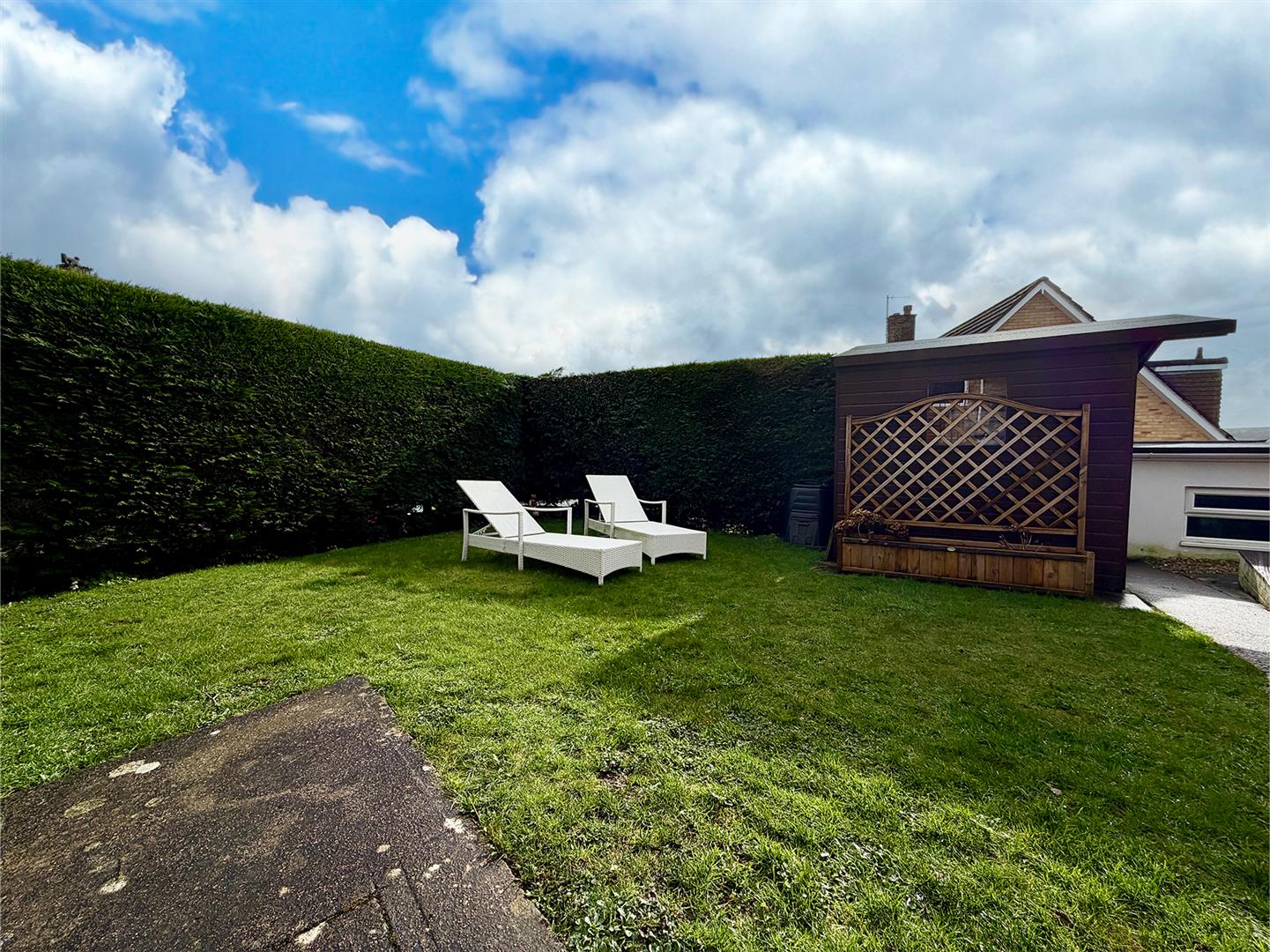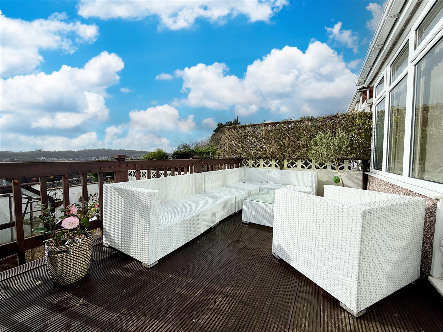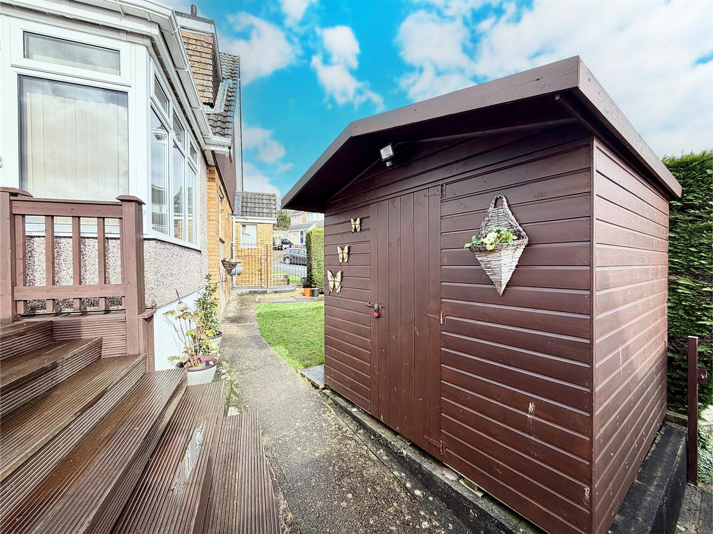 Outside - The property is approached via a concrete path bordered by an area of freshly-laid lawn. There is additional off-street parking and a metal gate provides access to the side and rear gardens. To the side there is an area laid to lawn and a shed, enclosed by hedge. This leads to a south-facing stone-chipped area enclosed by a painted brick wall and housing a greenhouse. Adjacent to the rear of the property is a raised decked seating area with lovely views over Plympton and beyond. A further gate provides access to the driveway and garage.