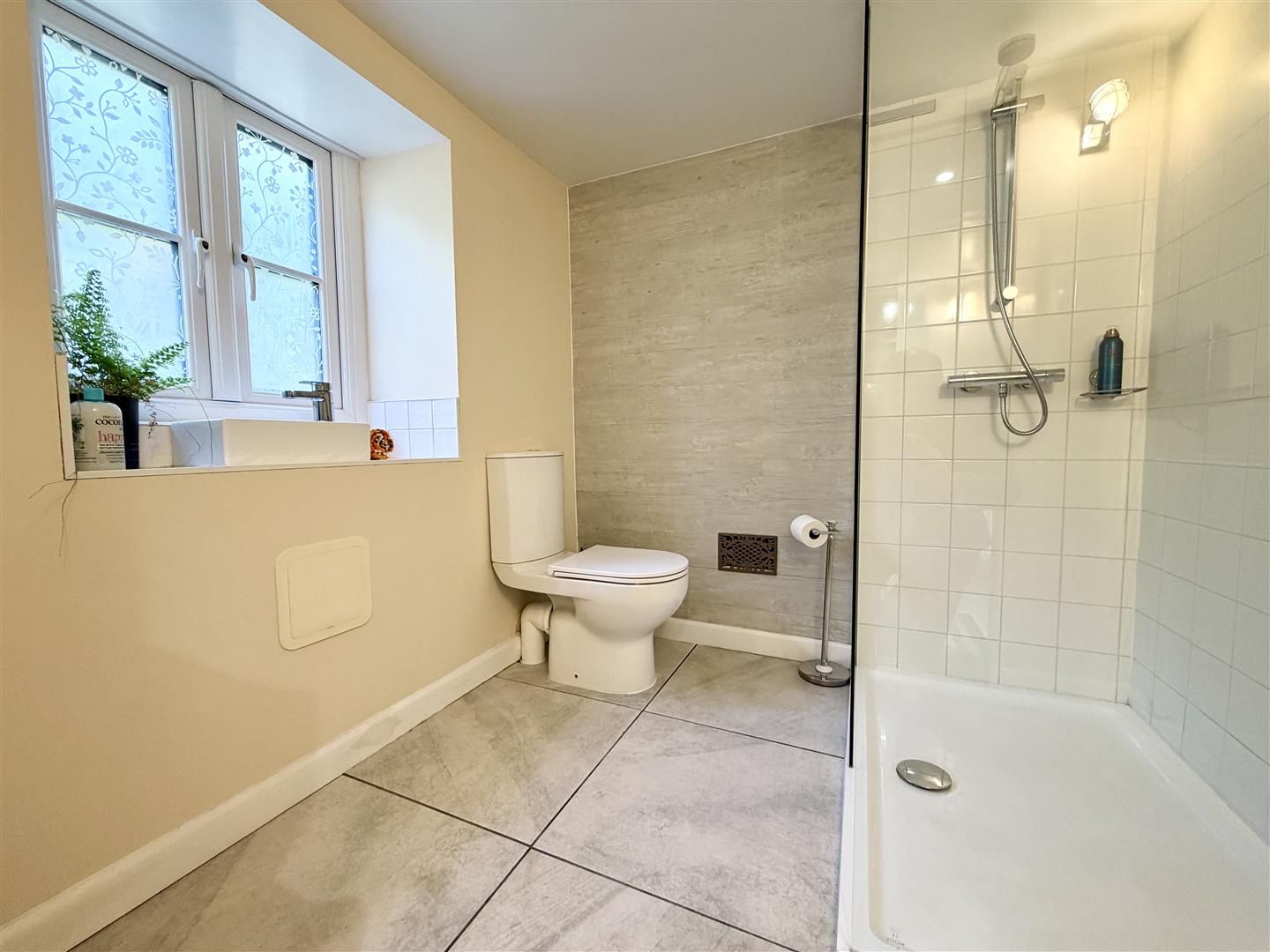 Downstairs Shower Room - 2.40 x 2.03 (7'10" x 6'7") - Matching suite comprising a walk-in double thermostatic shower, wash handbasin with mixer tap set onto the tiled window ledge and close-coupled wc. Obscured uPVC double-glazed window to the rear elevation.