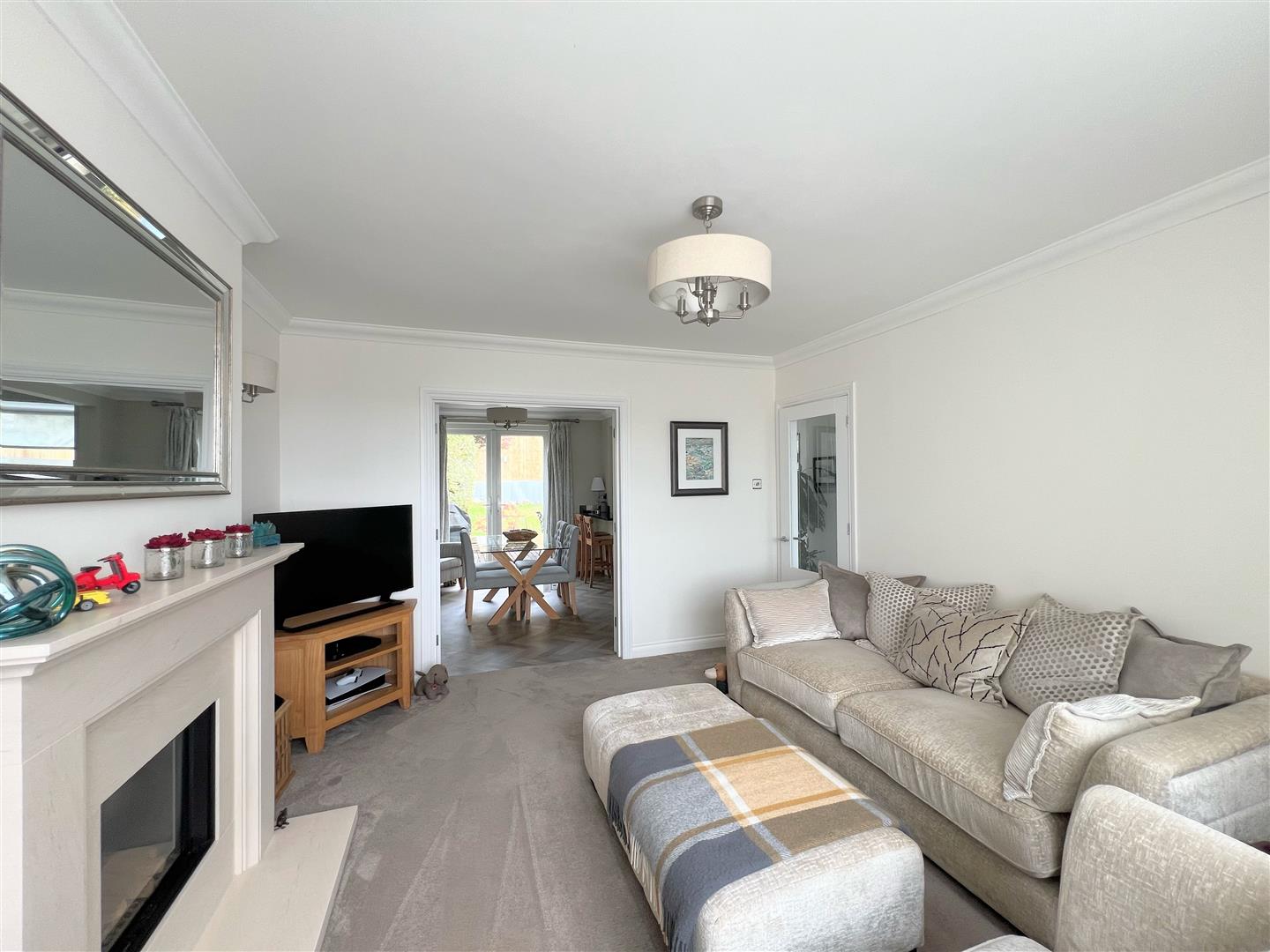 Living Room - 4.17 x 3.66 max (13'8" x 12'0" max) - 4.17 x 3.66 max narrowing to 3.41. Feature gas fireplace with a stone hearth and surround. Double wooden doors, with inset glass panes, leading to the kitchen/diner. uPVC double-glazed window to the front elevation.