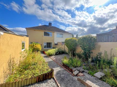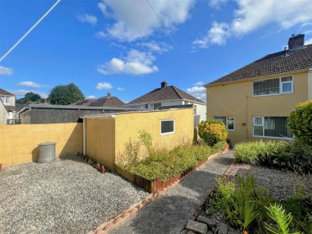 Outside - The property is approached from a public footpath, through a metal gate with a paved path leading to the front porch. A shared driveway to the side of the house leads to the garage. There is a large area laid to stones with edging, bordered by flowers. The rear garden is accessed via a wooden gate at the end of the driveway. The garden is fully enclosed, with a path running down the centre with sections laid to a mixture of stones and flowerbeds.