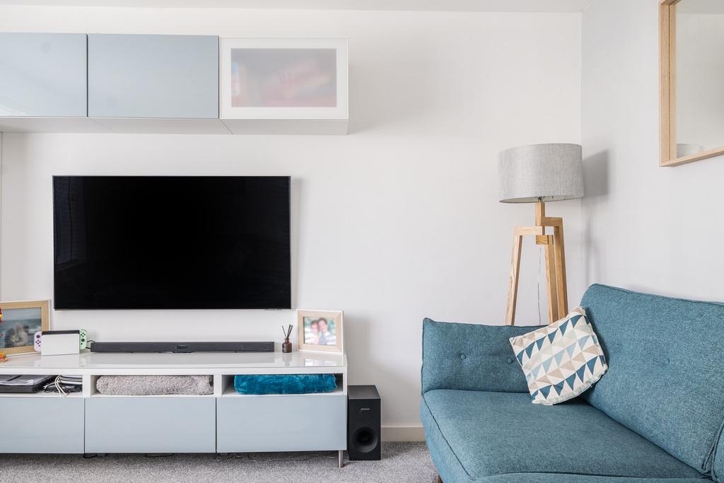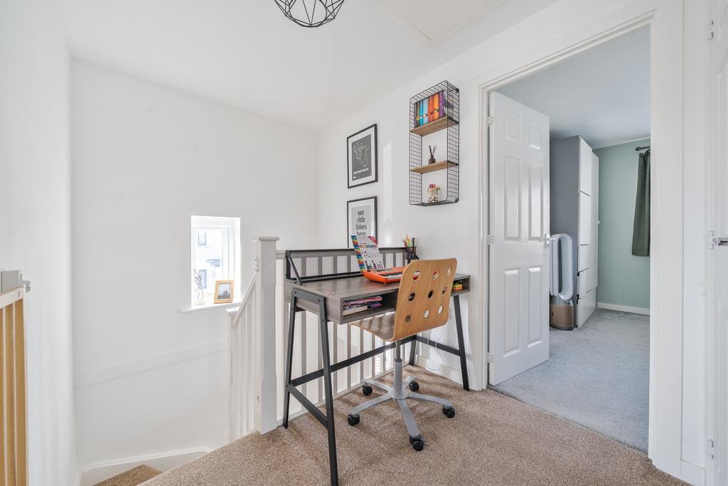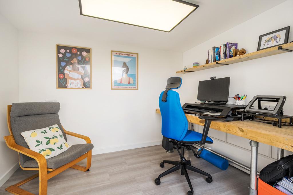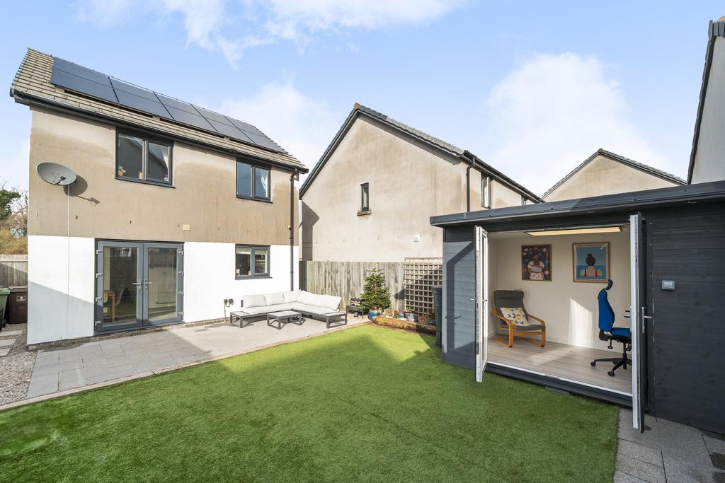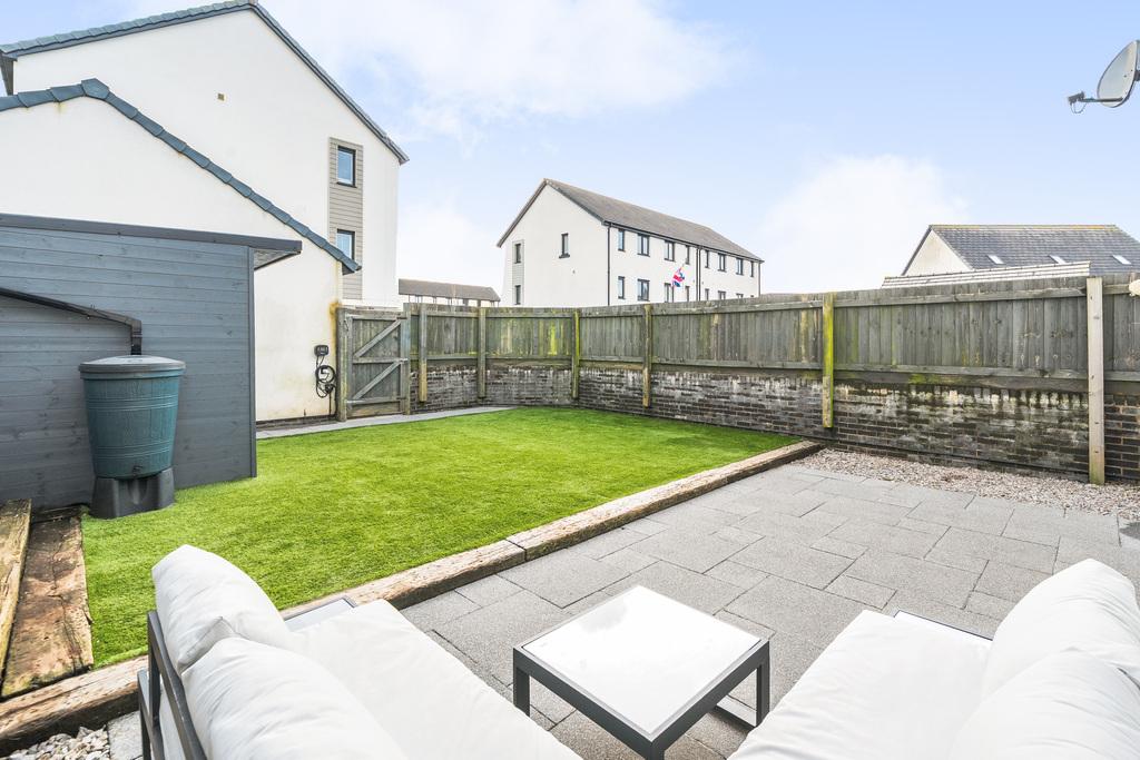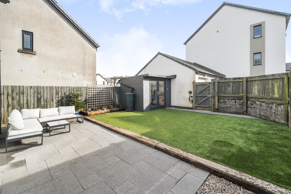 - Sunny south-facing landscaped rear garden with patio, artificial lawn and external lighting.