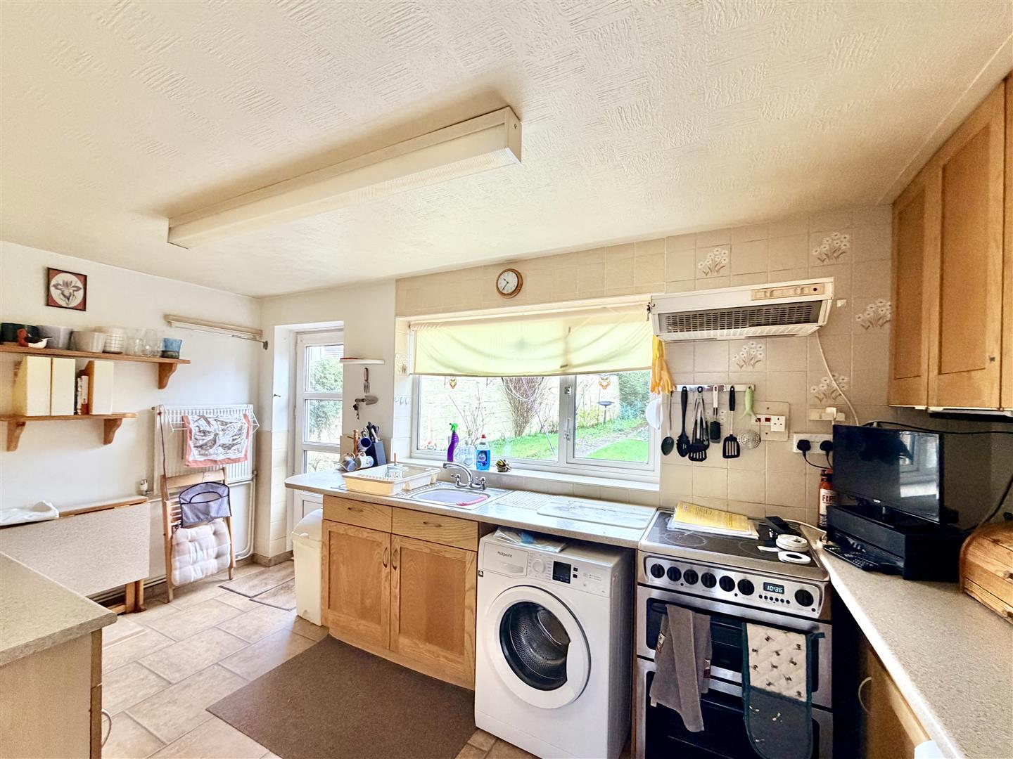 Kitchen/Diner - 4.52m x 2.31m (14'10 x 7'7) - Range of base and wall-mounted cabinets with matching fascias and work surfaces. Partly-tiled walls. Stainless-steel single drainer sink unit. Space and plumbing for a washing machine. Space for fridge and freezer. Space for free-standing cooker. Under-stairs storage cupboard. Window to the rear elevation overlooking the garden. Door leading to outside.