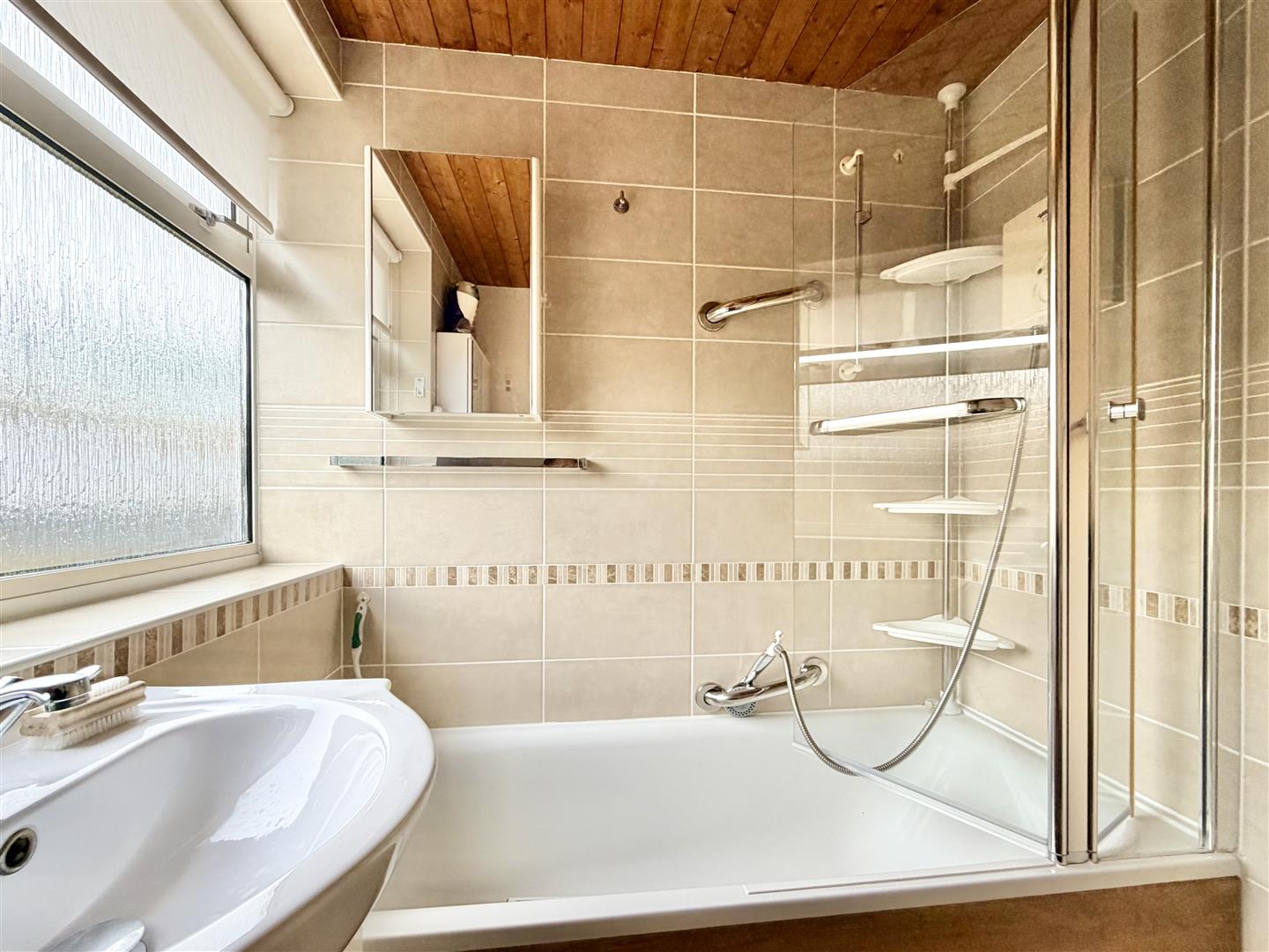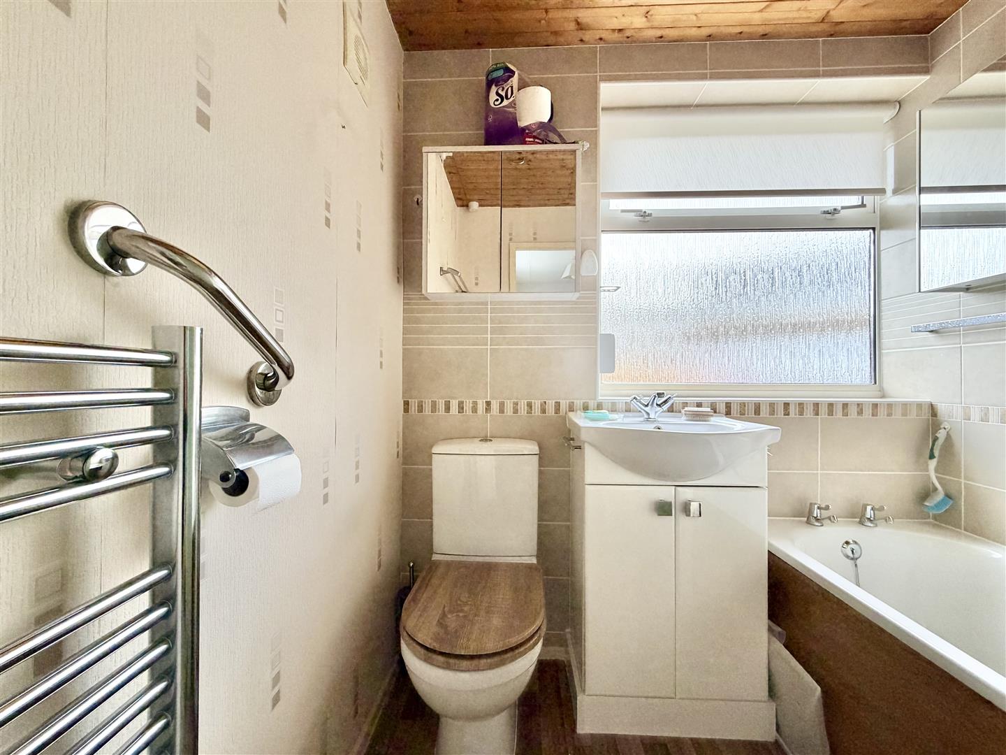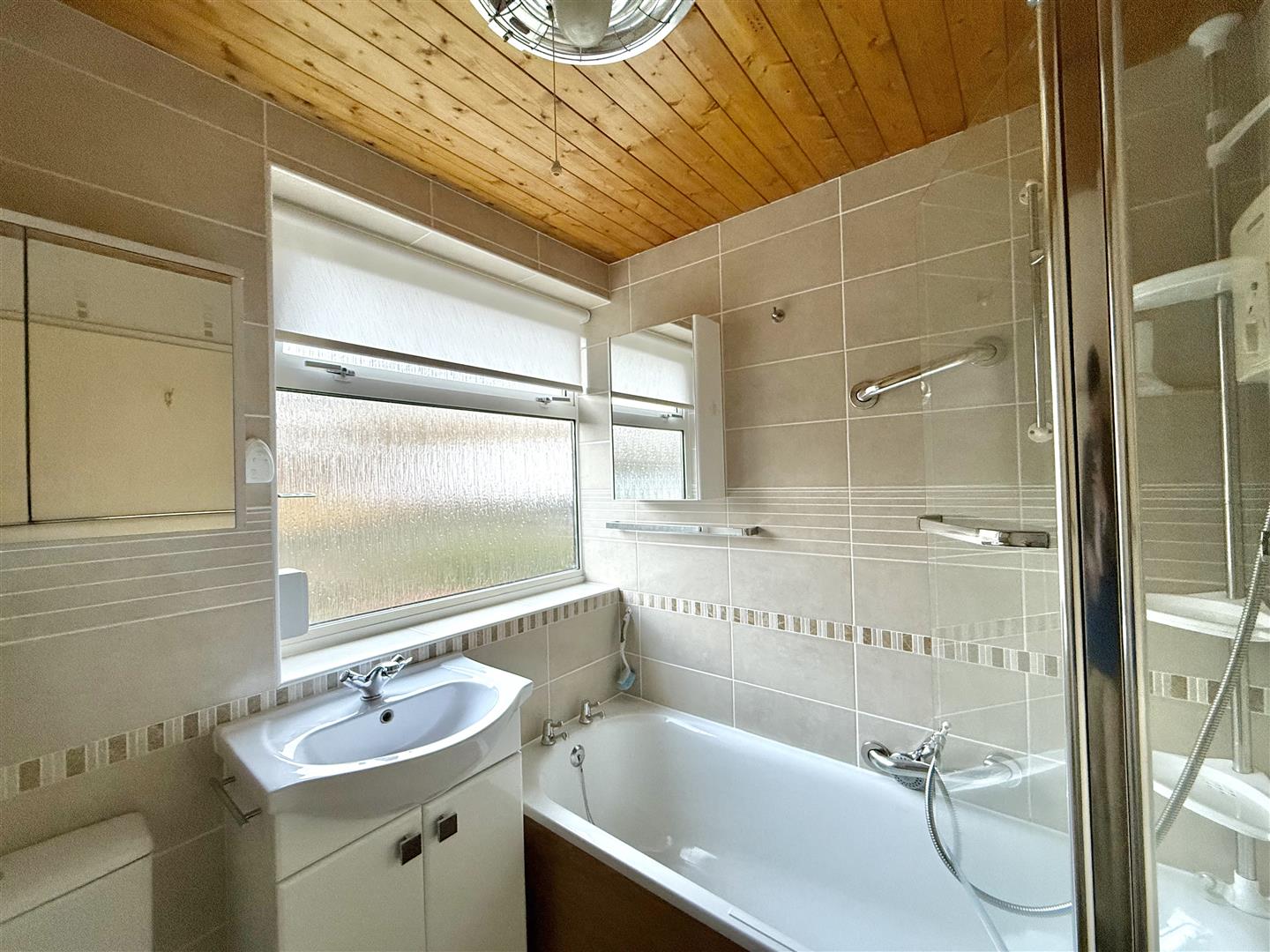 Bathroom - 1.91m x 1.70m (6'3 x 5'7) - Comprising a bath with a shower system over and a glass screen, wc and basin with storage beneath. 2 mirrored cabinets. Chrome towel rail/radiator. Partly-tiled walls. Obscured window to the rear elevation.