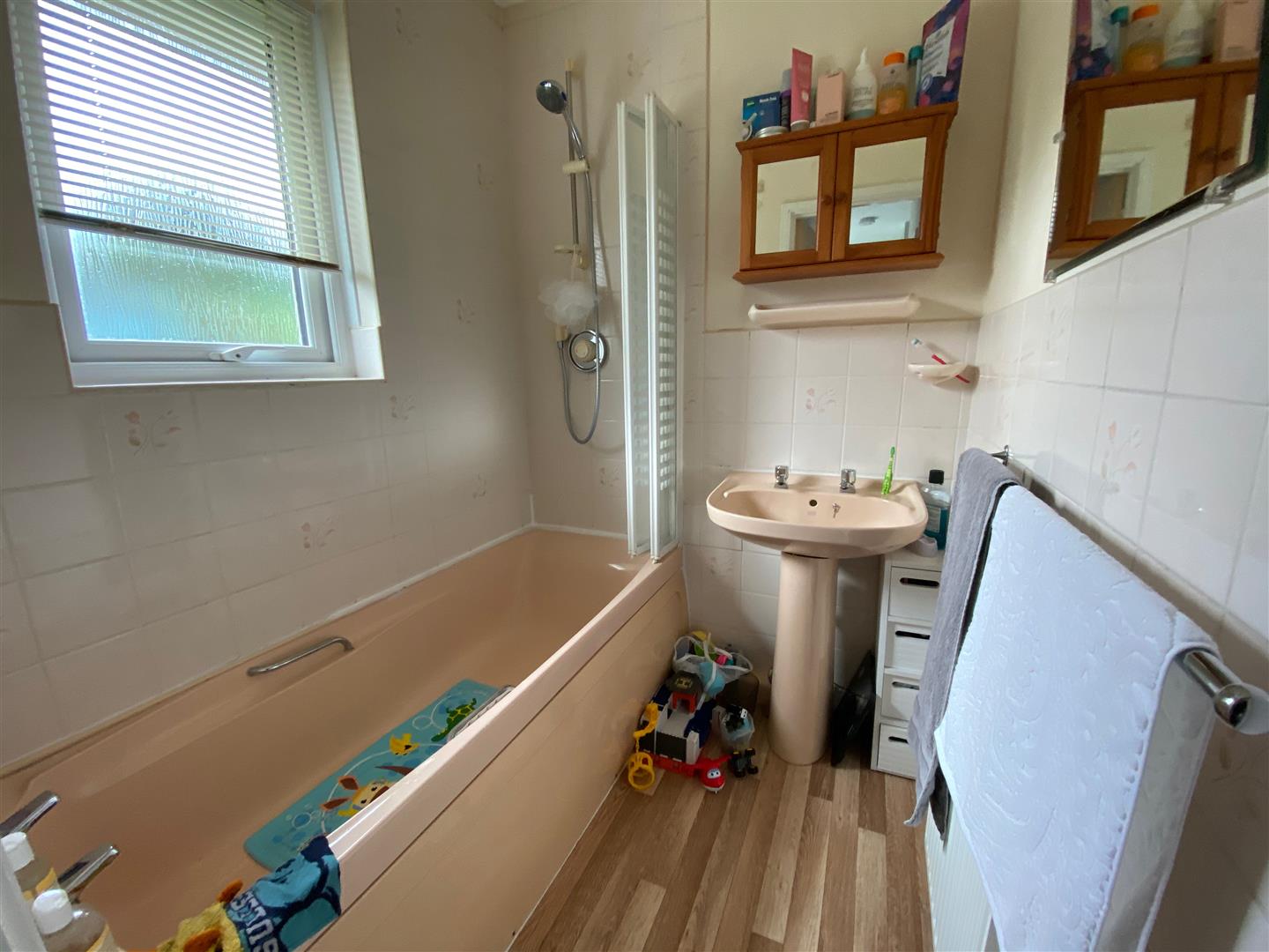 Bathroom - Comprising fitted bath with shower system over, rail and curtain and wash handbasin. Partly-tiled walls. uPVC obscured double-glazed window to the rear elevation.