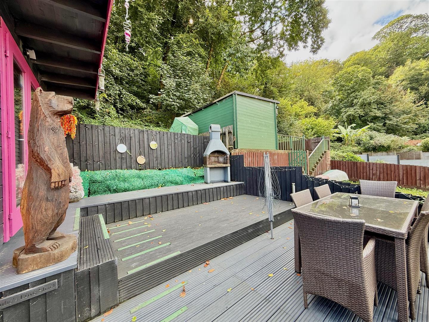Outside - To the front there is a full-width brick-paved driveway with gates opening onto a matching brick-paved drive running alongside the house accessing the garage. A paved pathway with an outside tap leads to a patio area. Steps ascend to the remaining areas of garden, which are laid to decking and stocked with shrubs. There is a timber shed and woodland views.