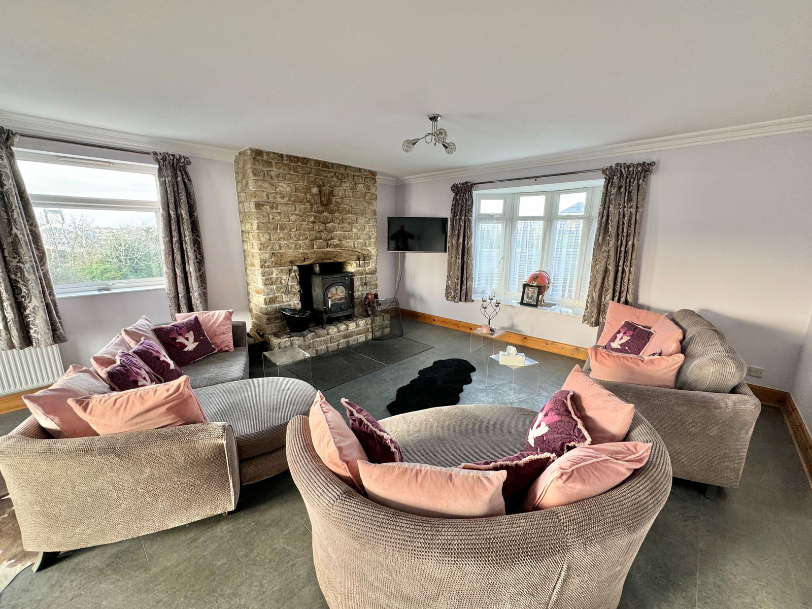 The sitting room has windows to the front and side elevation and French doors to the rear elevation, a feature wood burning stove with a natural stone fireplace, oak mantle-piece and slate hearth, stone effect flooring, sliding patio door leading out to a large south westerly facing wood decked terrace with steps to the lower ground.