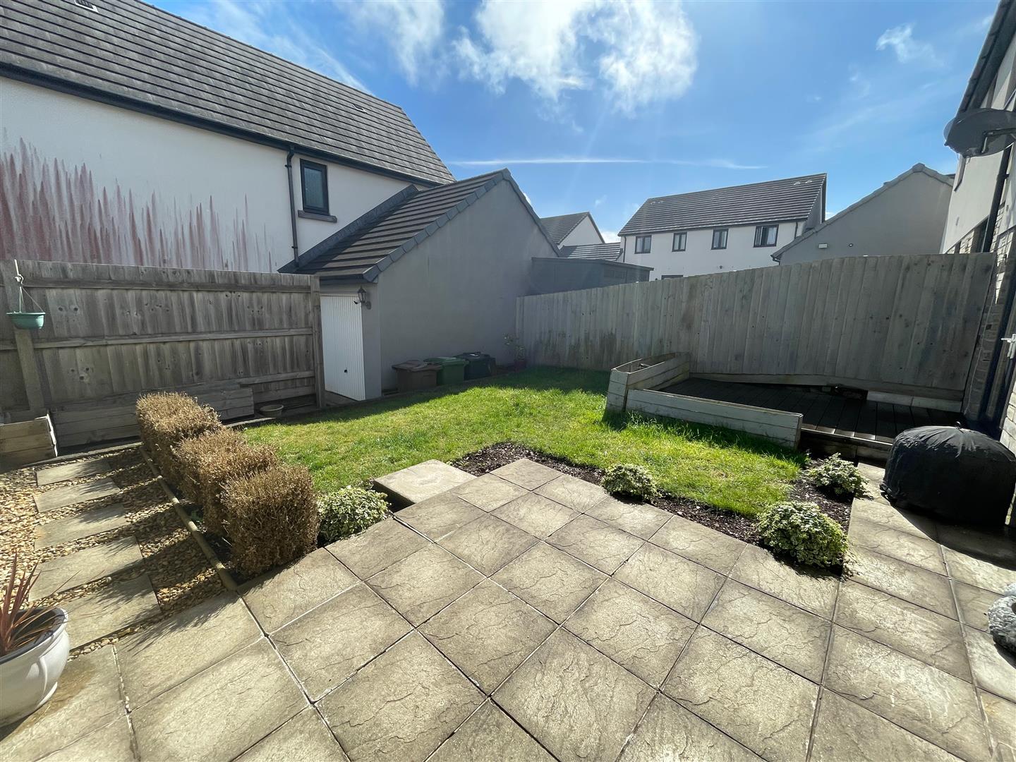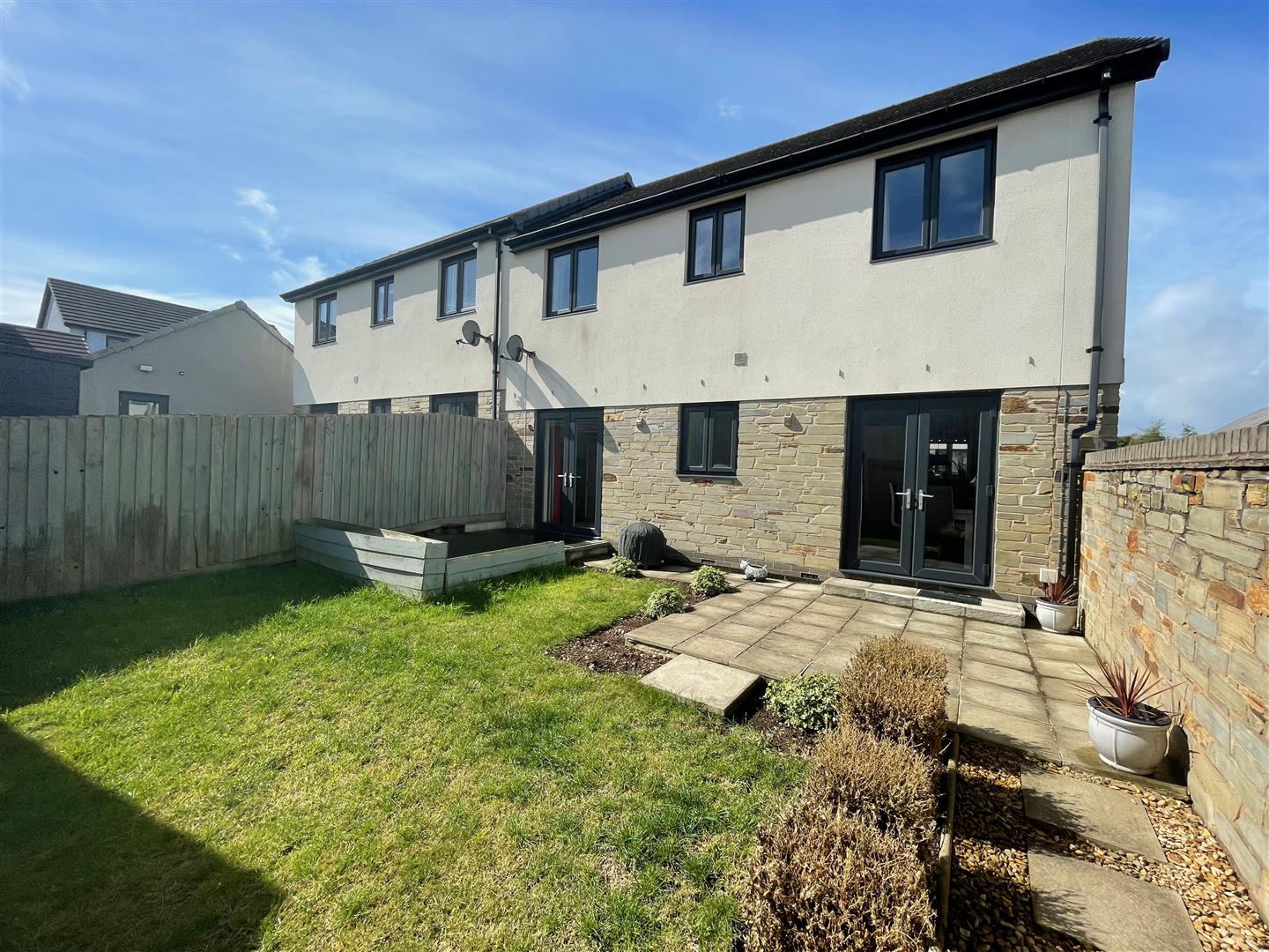 Outside - There is an open gravelled area to the front of the property. To the rear there is a fenced and walled enclosed garden with a lawned central area, patio sitting area and decked area adjacent to the rear of the property. A pathway leads down to the single garage.