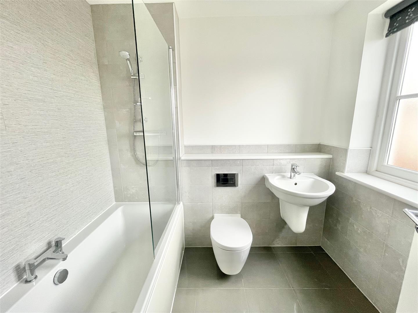 Family Bathroom - 2.28 x 1.91 (7'5" x 6'3") - Contemporary suite comprising a bath with a shower unit over and shower screen, toilet with a boxed-in cistern and sink unit. Obscured double-glazed window to the rear elevation.