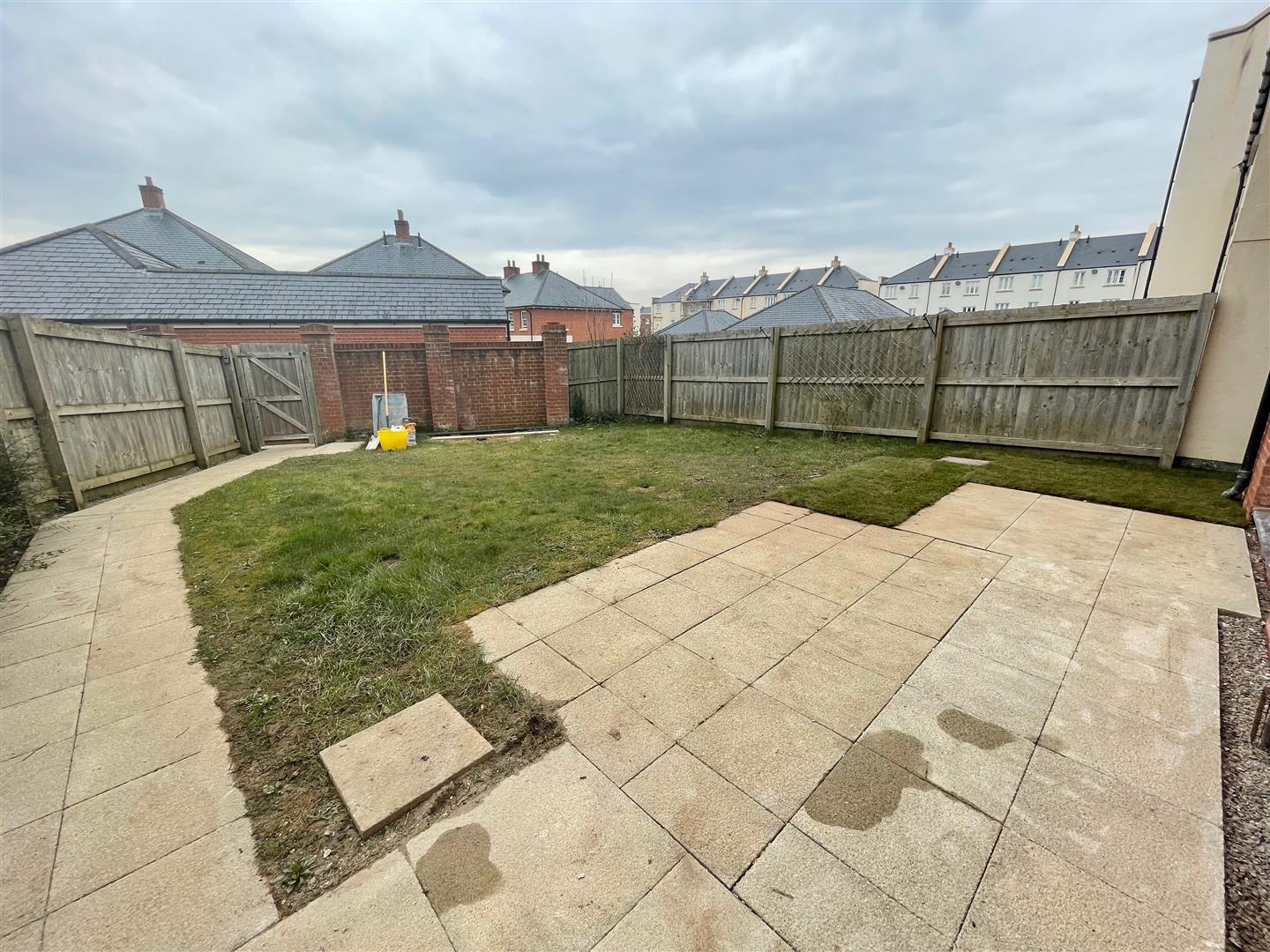 Outside - To the rear of the property there is a fenced enclosed garden with a paved area adjacent to the rear of the property leading to a lawned section. A path leads down to the rear gates. From the rear, across the parking area is the detached double garage with parking in front.