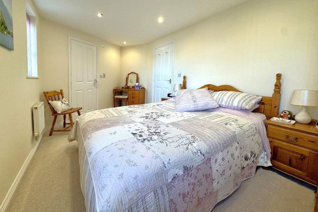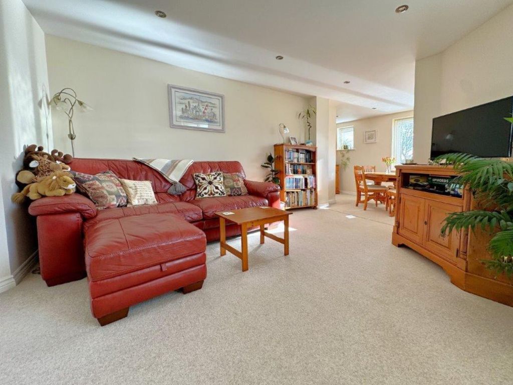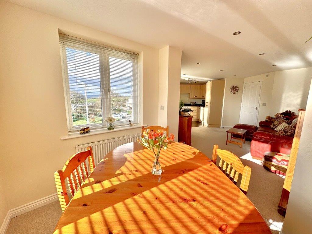 Boasting a west-facing aspect with far-reaching views into Cornwall, the property offers a bright, L-shaped open-plan living space with enhanced spotlighting, and a versatile area for dining or working from home. The accommodation comprises two spacious double bedrooms—including a master with en-suite—a principal bathroom, and a reception hall with dedicated cloak and utility storage.