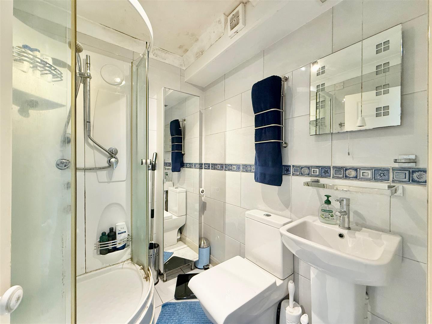 Ensuite Shower Room - 1.80m x 1.63m (5'11 x 5'4) - Comprising an enclosed shower with curved glass doors, wc and pedestal basin. Tiled walls. Tiled floor.