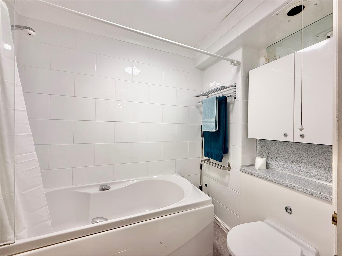 Bathroom - 2.11m x 1.55m (6'11 x 5'1) - Comprising a bath with a mixer tap shower over, wall-mounted corner basin and wc with a push-button flush. Wall-mounted cabinet. Tiled walls.