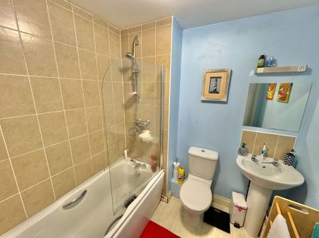 The family bathroom is fitted with matching white 3 piece suite comprising, a low level WC, pedestal wash hand basin, panel enclosed bath with a direct feed shower unit above and glass shower screen, tiled splash backs and wooden effect flooring.
