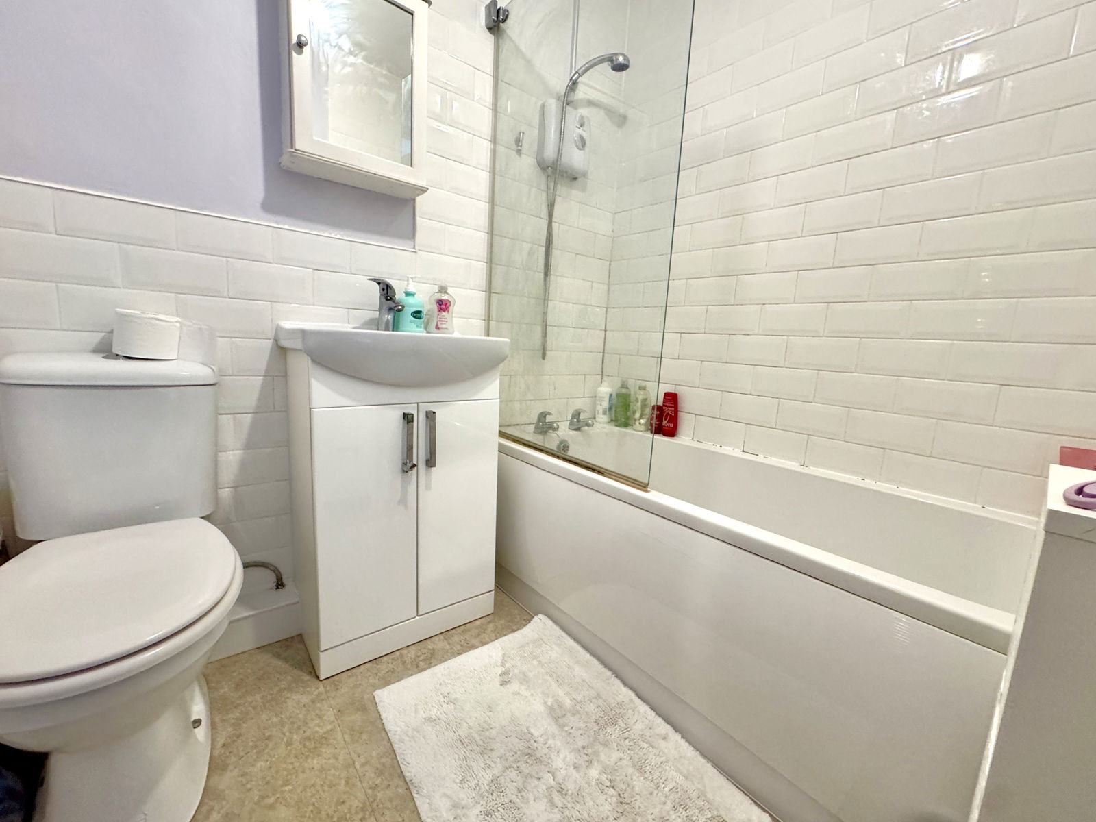 Matching suite comprising panelled bath with Triton electric shower over, low level w.c, wash hand basin with storage under, part tiled walls, extractor fan, heated towel rail.