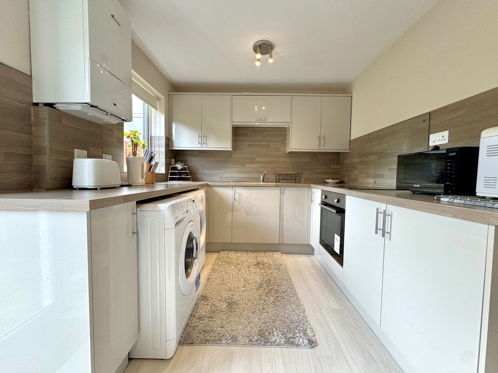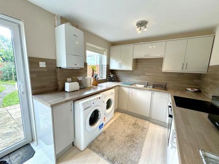 Roll edged worksurfaces with cupboards and drawers under and matching wall units, single drainer one and a half bowl stainless steel sink unit with mixer tap, built in electric oven and four ring gas hob, plumbing for washing machine, wall mounted gas boiler which serves domestic hot water and central heating system, PVCu double glazed window and sliding patio door to rear.