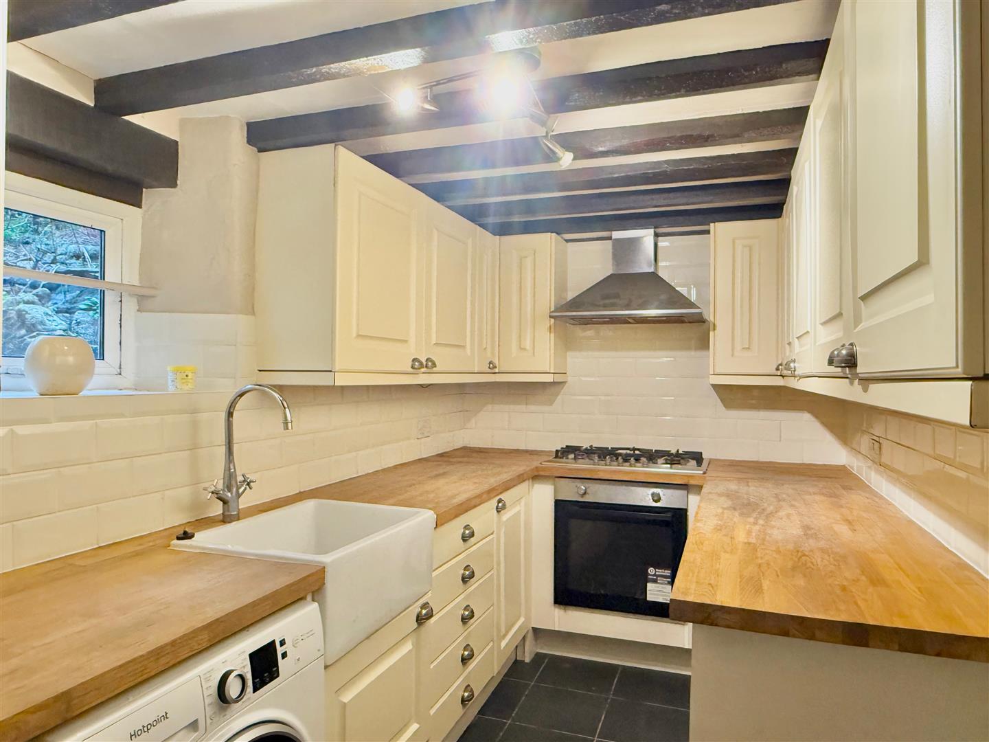 Kitchen - 4.6 x 1.98 (15'1" x 6'5") - Matching wall and base units with straight-edged work surfaces. Butler-style sink with mixer tap. Built-in electric oven and gas hob. Other built-in appliances include dishwasher, fridge and freezer. Space for a washing machine. Window to the rear elevation. Door leading to the rear garden.