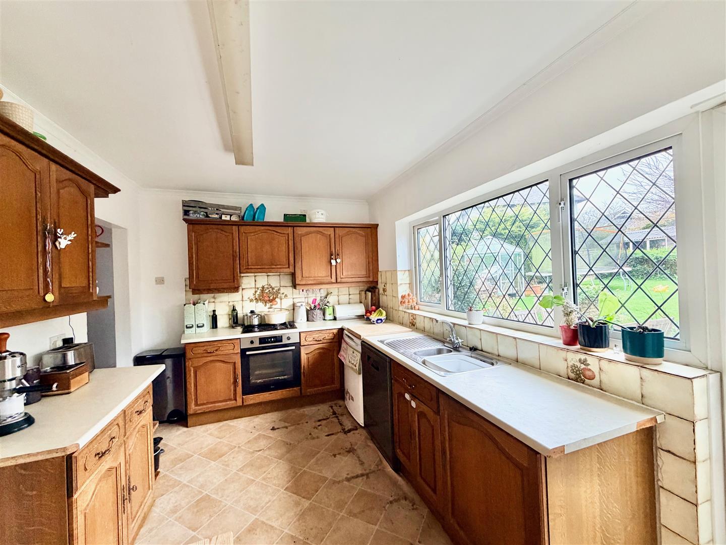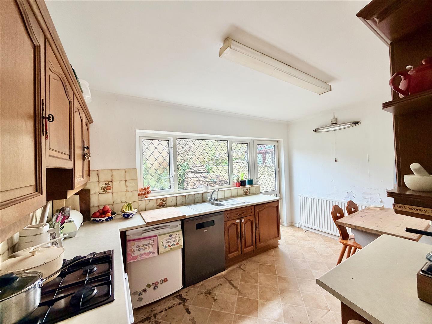 Kitchen/Dining Room - 4.22m x 2.69m (13'10 x 8'10) - Space for dining table and chairs. Range of base and wall-mounted cabinets with matching work surfaces and splash-backs. Inset stainless-steel one-&-a-half bowl sink unit. Built-in oven. Separate 4-burner gas hob. Space and plumbing for dishwasher. Space for fridge. Window to the rear overlooking the garden. Doorway leading to outside.