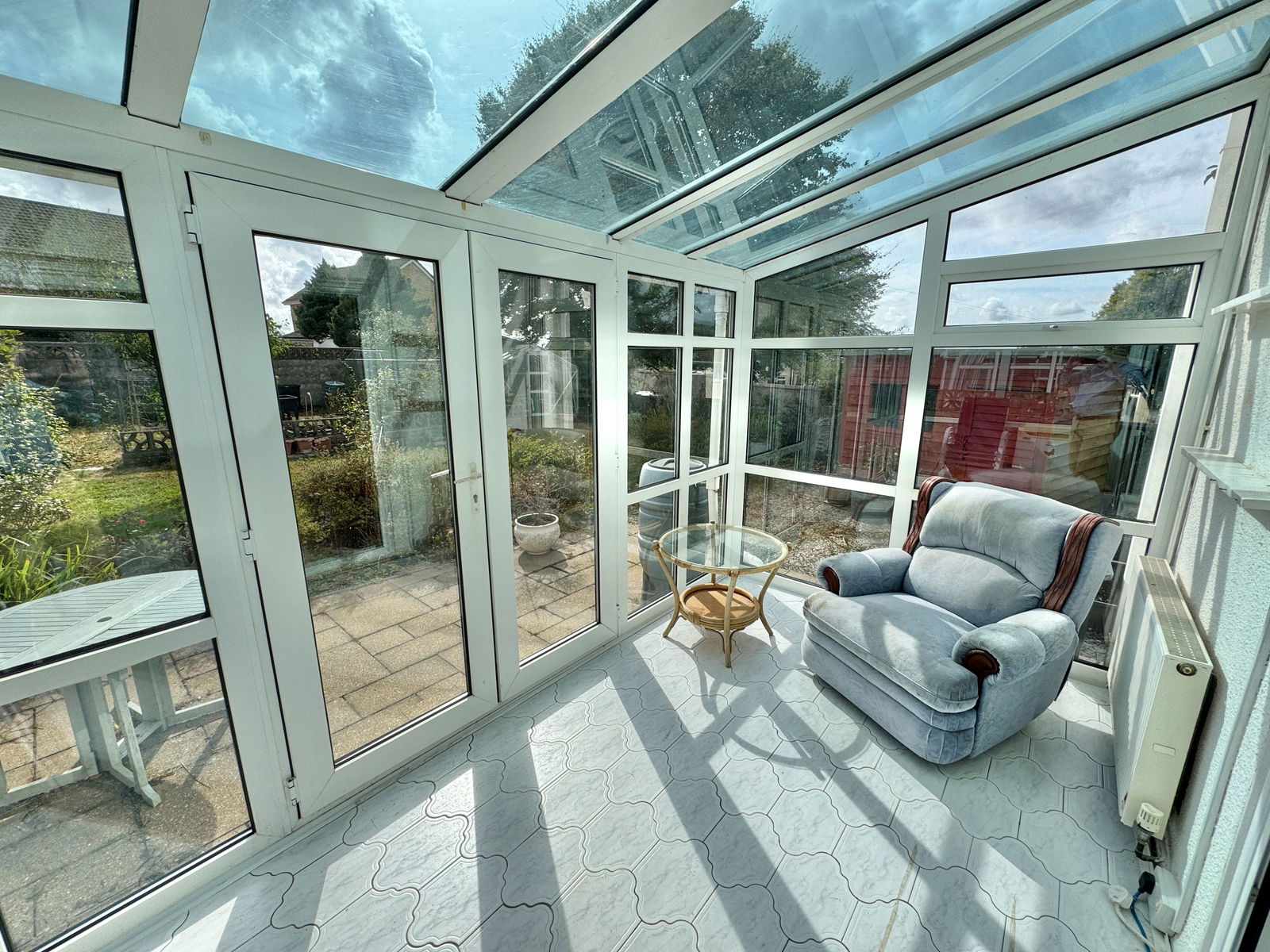 Externally, to the front of the property, there is a driveway providing off-road parking and access to the garage, which has power, lighting, and an electric up-and-over door. The front garden is wall-enclosed and gravelled for ease of maintenance. A side path leads to the front door, with a further gate providing access to the rear. The rear garden is a fantastic south-facing, fully wall-enclosed and productive family space, featuring fruit beds, fruit trees, lawns, gravel patio terraces, a greenhouse, and two sheds.